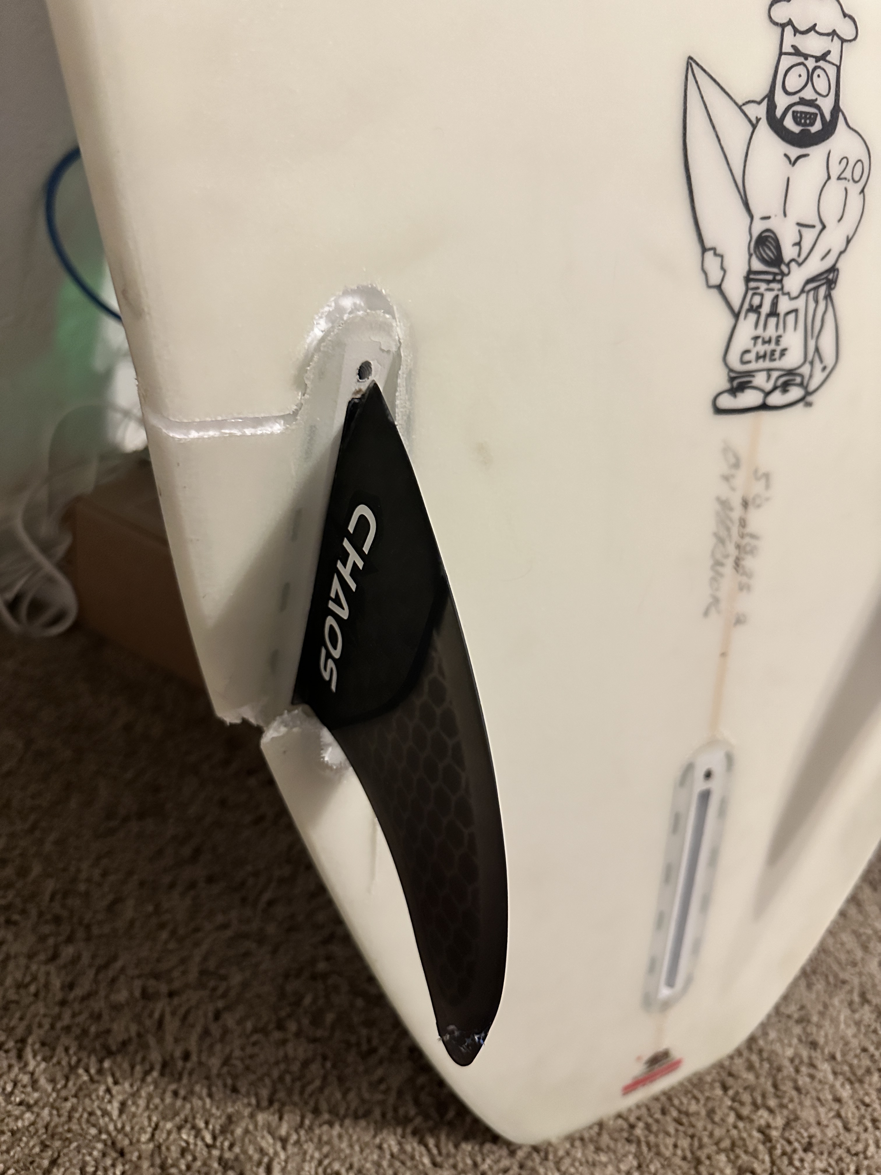 I will say that I once owned a Canyon Thruster shaped by Rusty back when he shaped for them. It was a 6’8” Rounded Pin and the best shortboard I had ever owned up to that time. I did a similar ding getting into the water on a shallow reef at Saint Andrews. Knocked the glass on fin and the foam chunk at the tail rail and left it dangling. Attached only by the deck fiberglass. No I didn’t repair it with new foam or expanding glue. I $#!t canned it. Back to Central Coast in SLO and bought another. But couldn’t get a 6’8 off the rack. Had to drop to a 6’3. But within a couple of days I was up in SC at 1st Peak making late drops on overhead low tide waves. I knew that whatever I did to that 6’8 it was never gonna be the same.