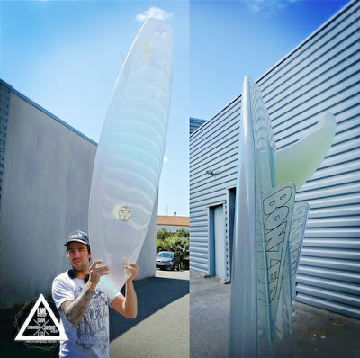 I can’t imagine that’s a rider, but it sure looks cool. I think they had to have glassed it heavy (to hold the shape true) then meticulously cleaned out the foam inside the board after splitting it along the rail. At least, that’s the only solution I can dream up other than a molded board, but that would have to be two halves glassed together.
