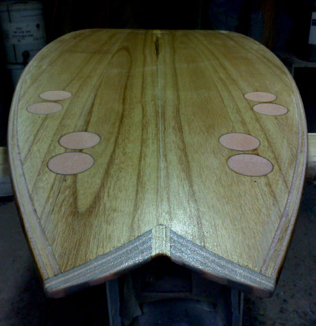 Thats HD foam where the FCS will go. Rule No.1 is…no wood next to plugs, so hence the exposed cores…not under-skin. This is a precaution against the skins getting wet, even though this wood, Pawlonia, is more water-resistant than Balsa. I also insert them with a lining of glass. All means to insulate the EPS from any cuts in the lamination. (Same for legrope-plugs…)