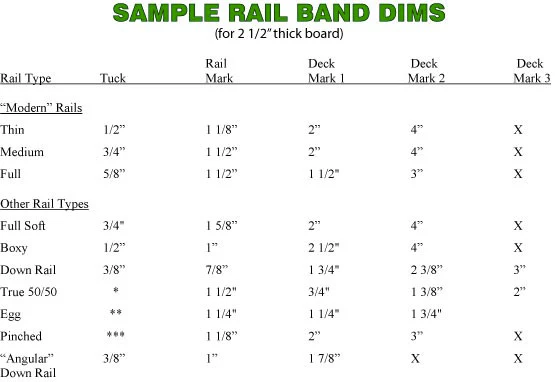 The greenlight chart is a good place to start, you can scale the numbers to match your thickness so in your case multiple the apex value by 2.75/2.5. I personally wouldn’t recommend doing that for this board but I prefer thinner rails. Below is a good video with a good explanation on copying rails. He recommends .25” above and below your apex mark.