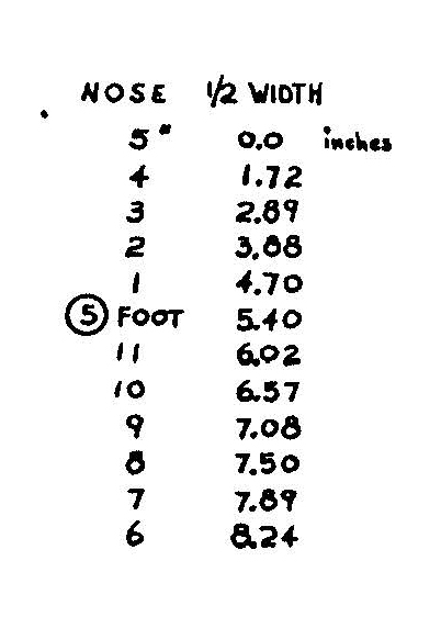 The ‘1/8" width for every 1" length’ rule-of-thumb helps to maintain the same outline curve or “proportion”. Notice the difference in outline curves when only width or length is change. The ‘1/8" rule’ will give you a width target, when desired length is known, but it doesn’t define the curve between the nose and the wide-point, or the tail and the wide-point. Neither answer is complete. In the end, it usually comes down to an approximation, derived from either a judicious application of an existing template, or a keen eye and a sharp pencil.