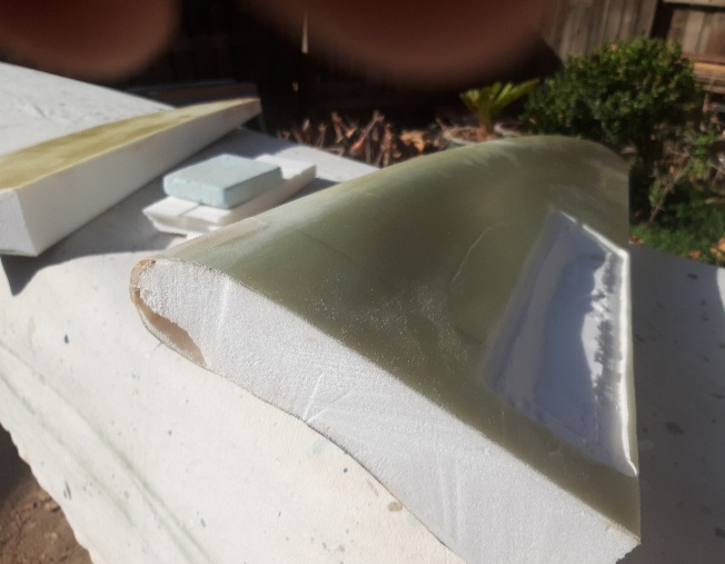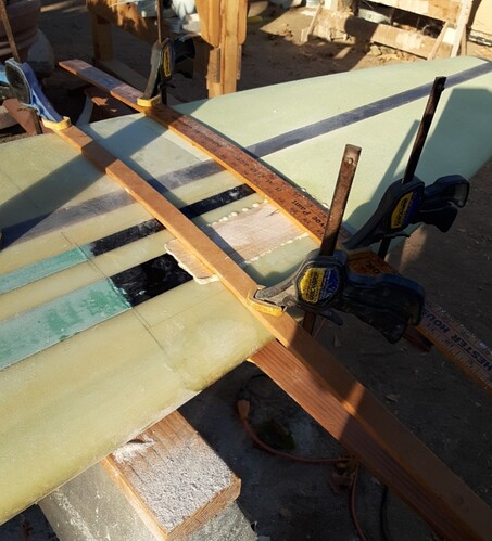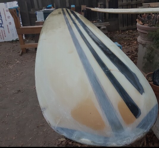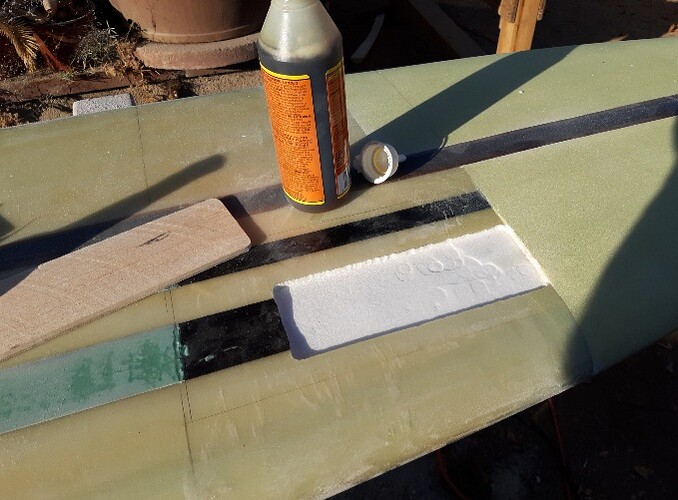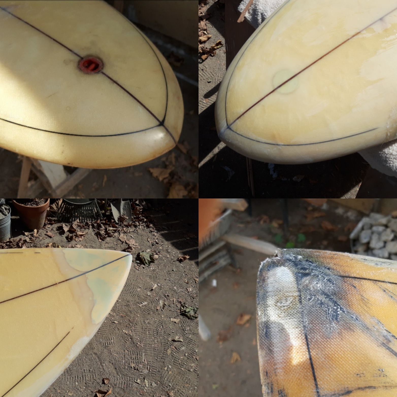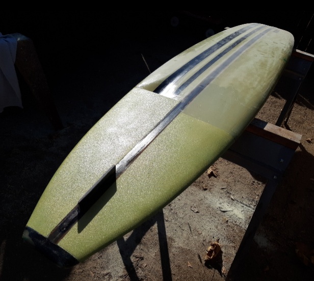 The channels along the black stripes could be filled with thickened resin and built up fiberglass layers. The fin was original but had been altered.