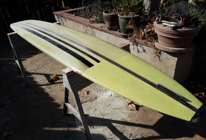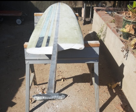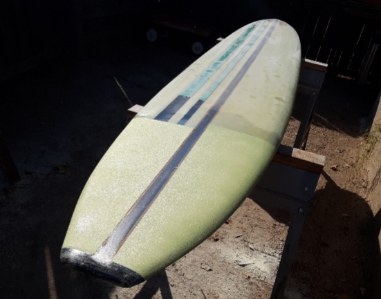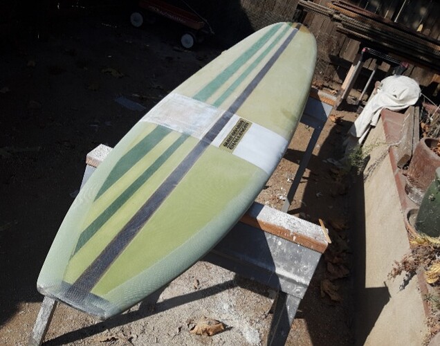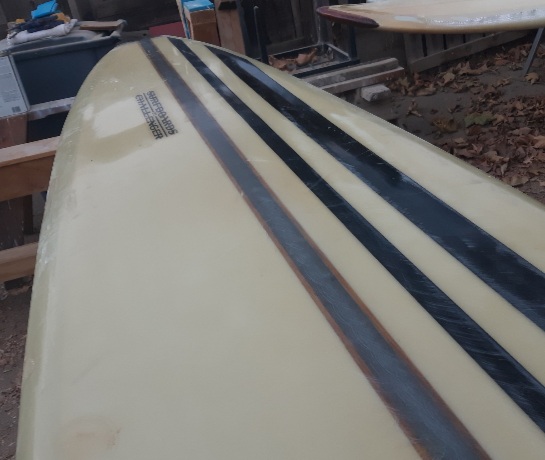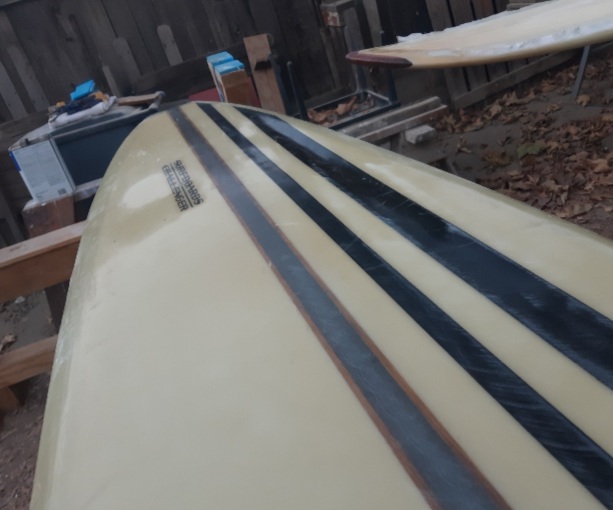 I like to think that the original shaper, and maker of this board, would be stoked to see it getting fixed up to ride again, despite the fact it’ll look a little different with the band around the tail, and the original stripes a different color (no more black!). I also like to think that someday I may drive by the surf shop where I picked it up, and say “yeah I had a blast on that old board I bought here, now that I got it patched up, I have it with me if you want to check it out”, and blow the smug smartasses away. Maybe that’s just a fantasy, but it helps keep me going on this, haha.
