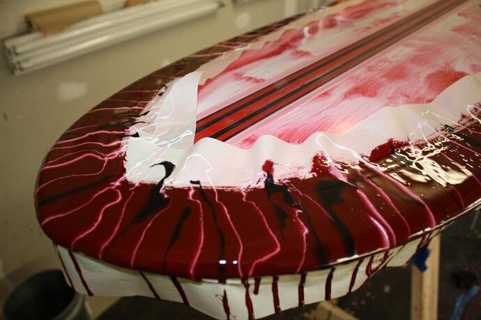 Time to Splash with the black walk around the board dripping or flipping the color on the hanging lap cloth not the bottom. Space the drips say 8" apart all down the rail. Then do the same with the blue or yellow whatever color you pick. Remember the closer you drip the more drips ya need takes more time. So space your drips giving you enough time. Now get your red and that 4" hotcoat brush. Now by dipping the brush in the red and going along cleaning off the brush on the rail. Just like you were going to remove excess on the bucket. Make surf you lap is all wet in color and DONT GET ANY COLOR ON THE BOTTOM. Carefully remove the paper off the bottom.