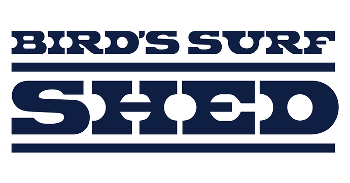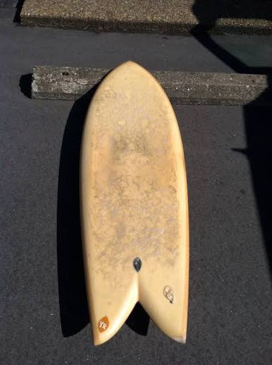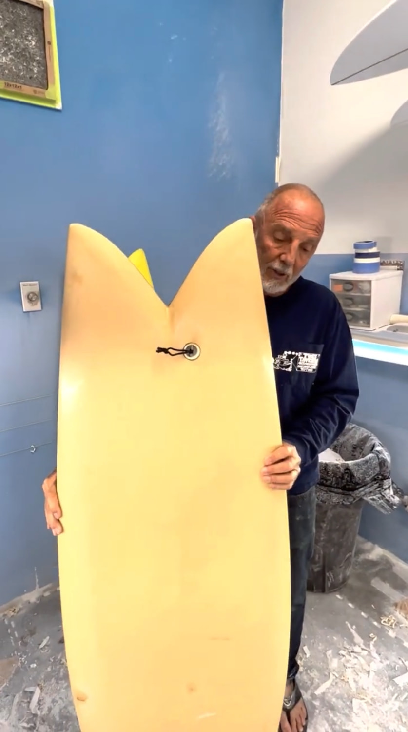 The Fish typically uses the “beak” nose, curving down from the deck to bottom surface. No bottom rail shaping. This would be a beak on a round nose — with a pointed nose it would be like a beak. (Look at my Bird surf shed post about the Steve Lis Fish Tidbits above).