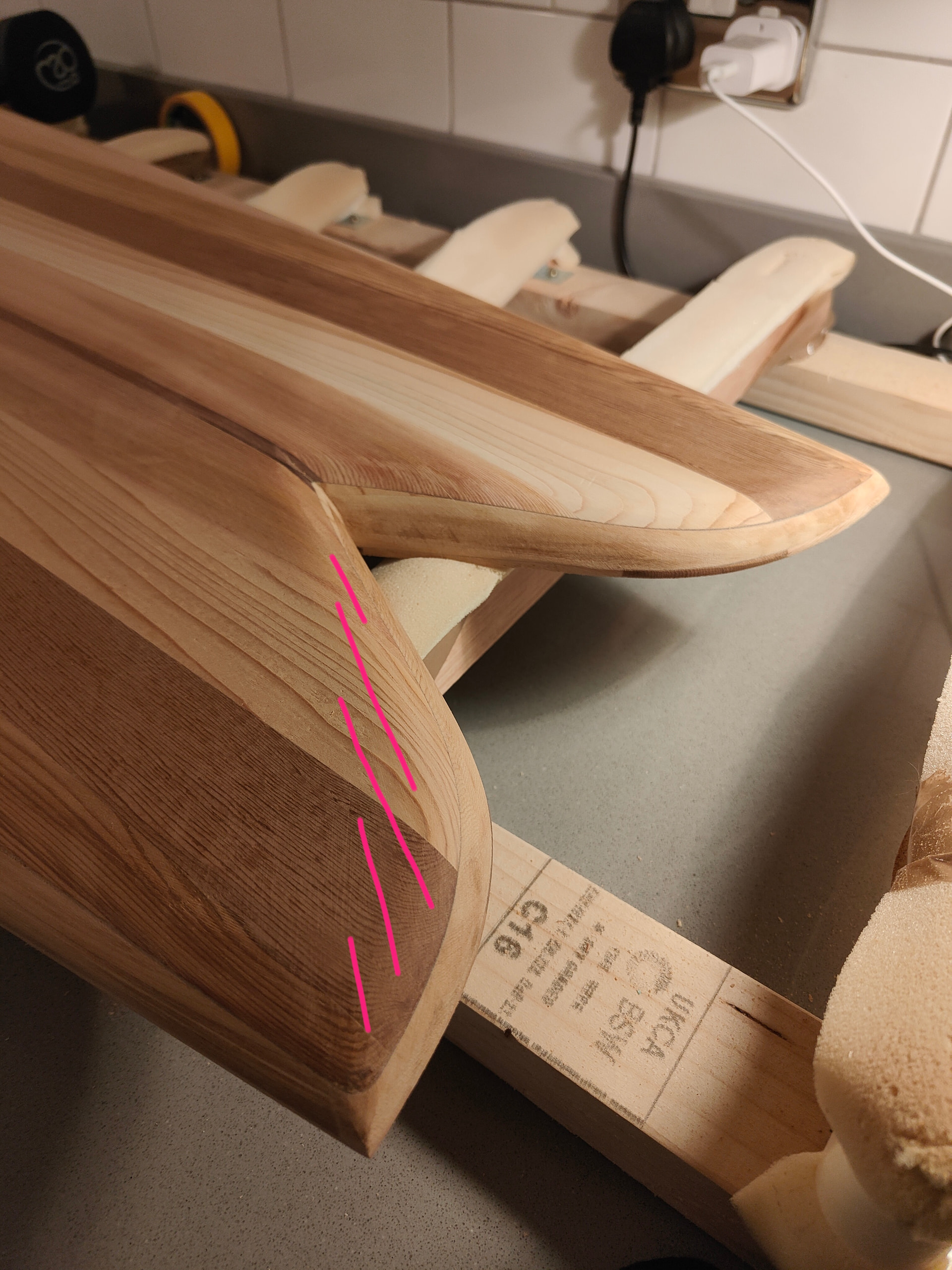 I’m in the process of shaping the tail on a hollow wood retro fish and I’m looking for some feedback on the curve on the inner cheek. I was wondering if I need to take more off of the shaded section below.