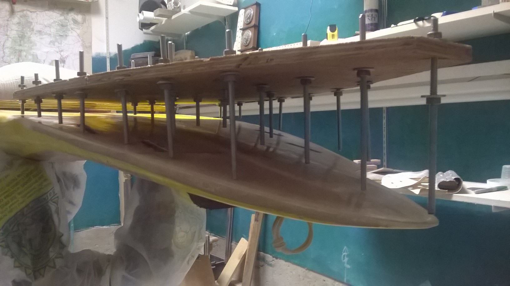 Pre-emptive, cheater post… The board under the sand bag is set to the true/geometric rocker apex, and I happen to be able to see (It shows up in the pics) the glue line, so I know very close to where three inches less (The thickness of the xps panel) than the apex is. I know it’s fairly relative, but it works for me and my homemade blanks.