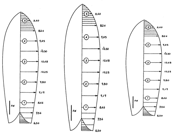The old standard for custom surfboard builders is to increase/decrease width by 1/8” for every 1”of length increase/decrease (up to 6”). But this method does not give the incremental changes needed for each width interval beyond the widepoint.