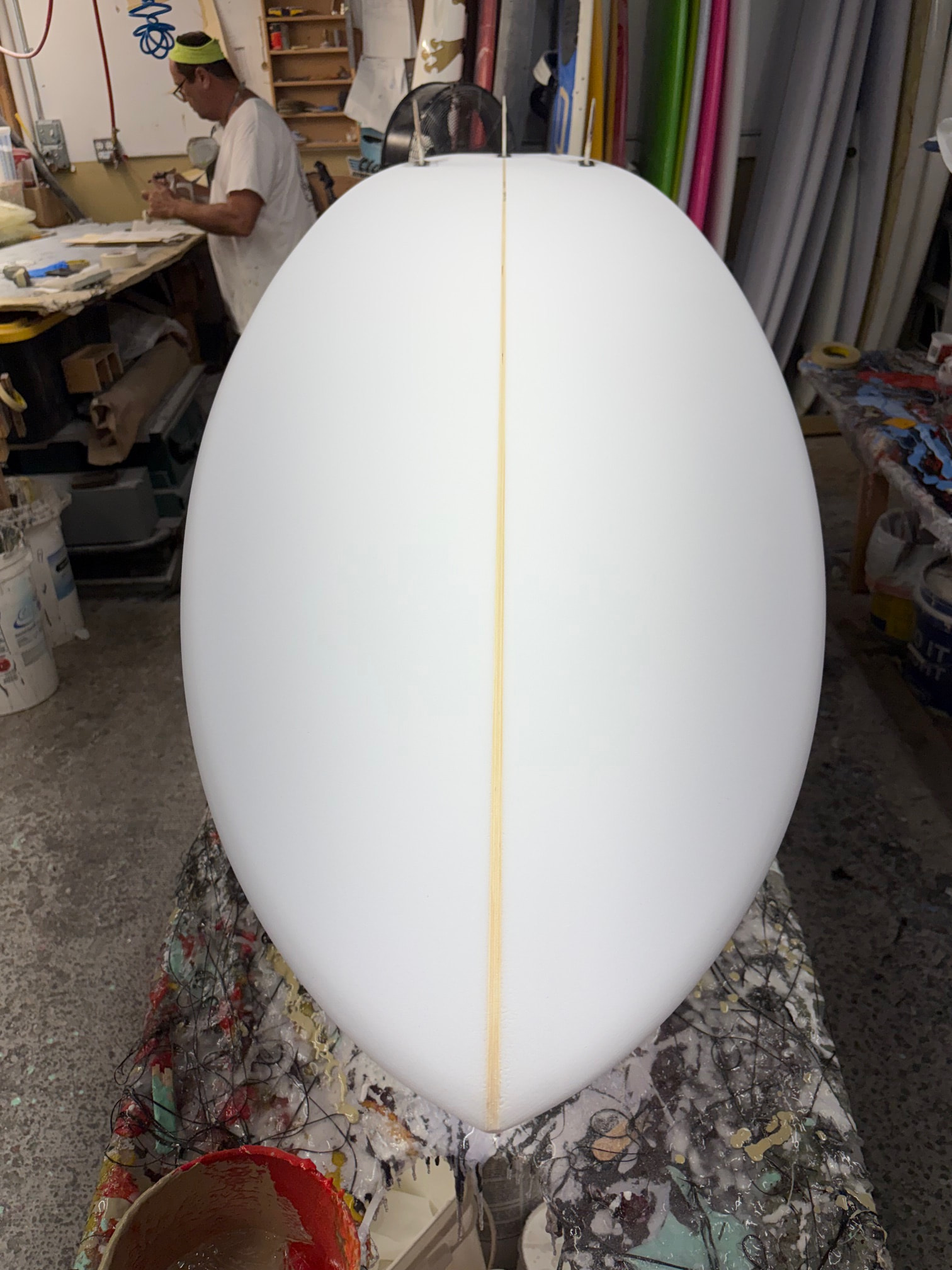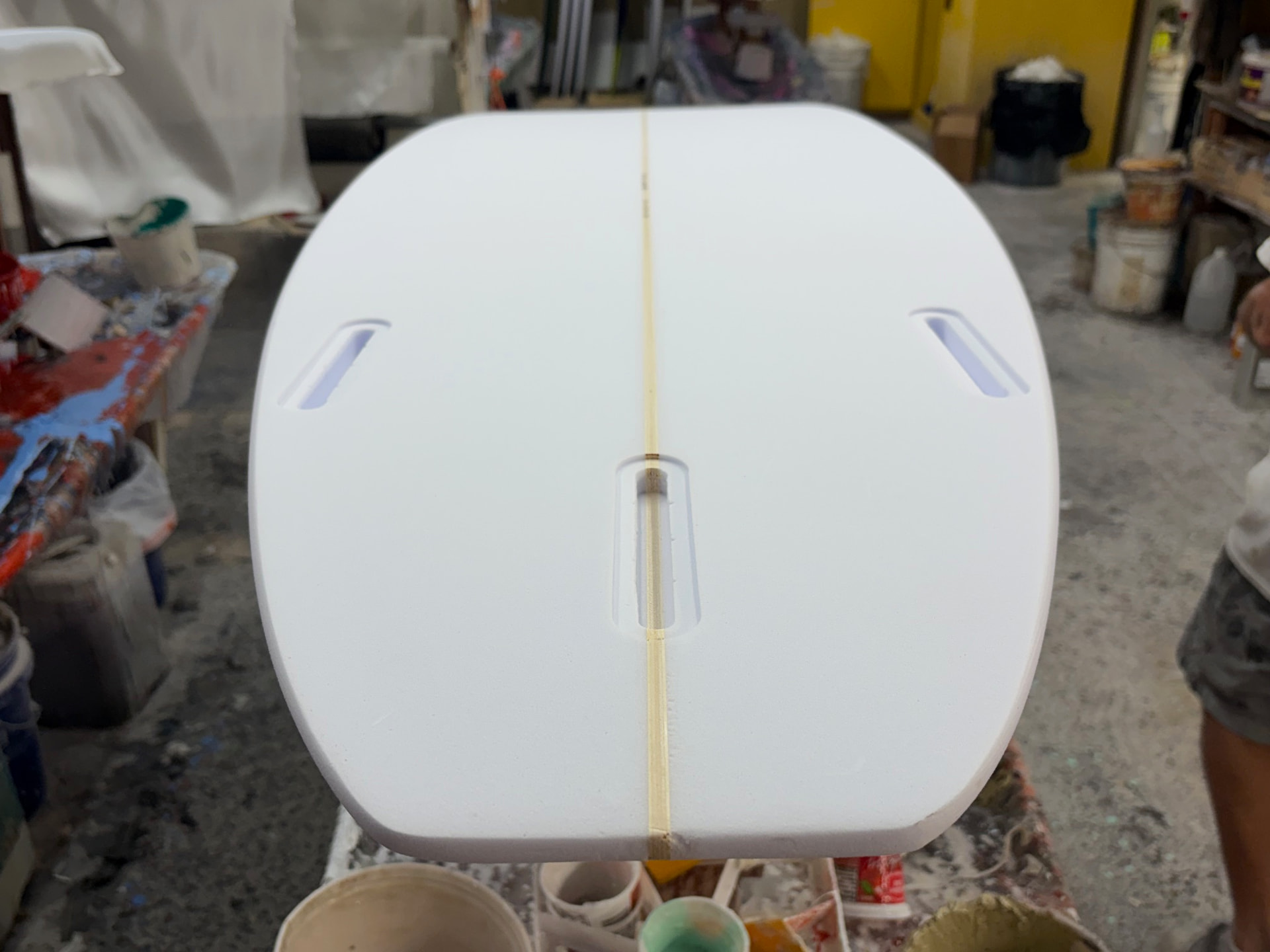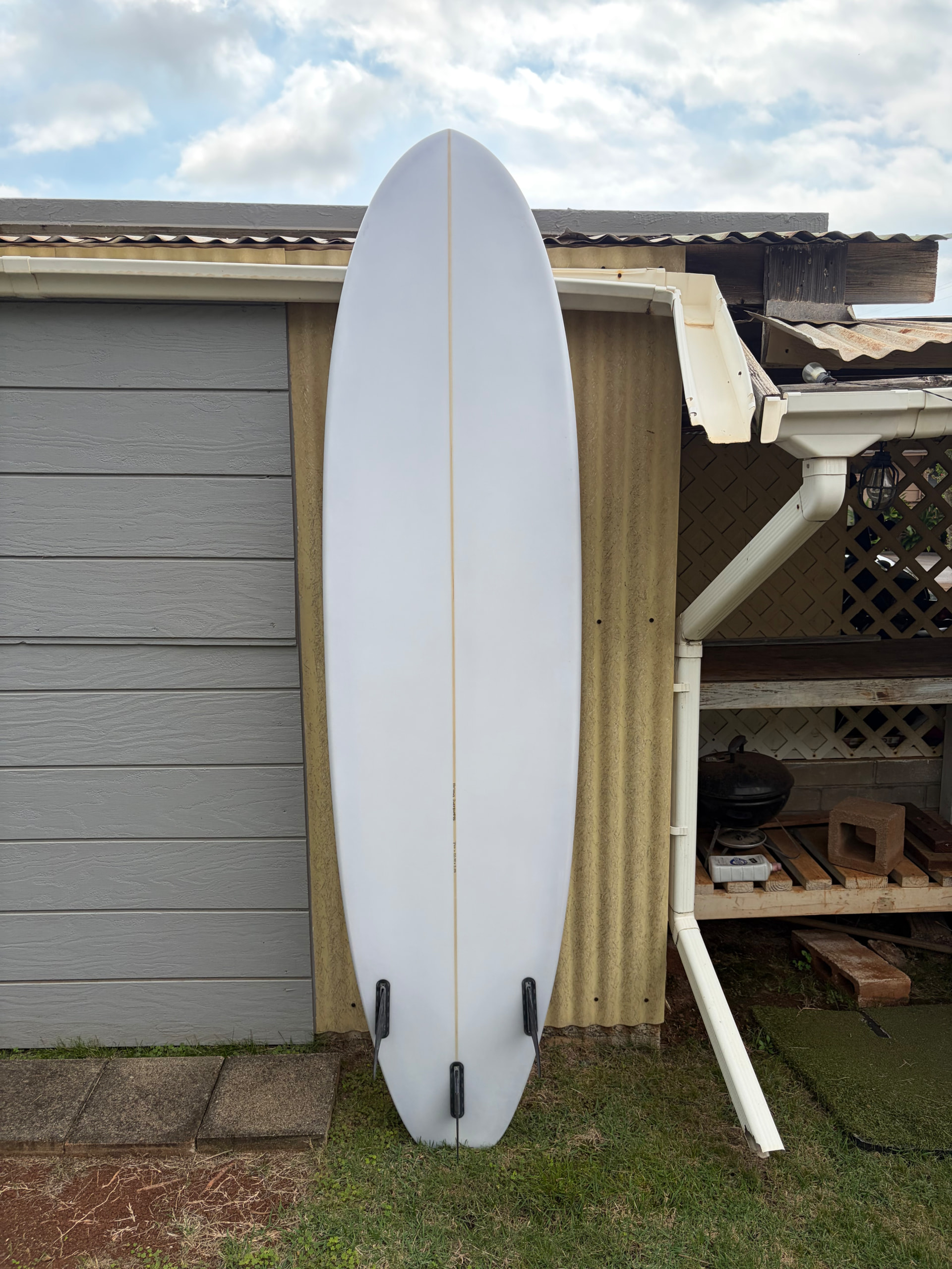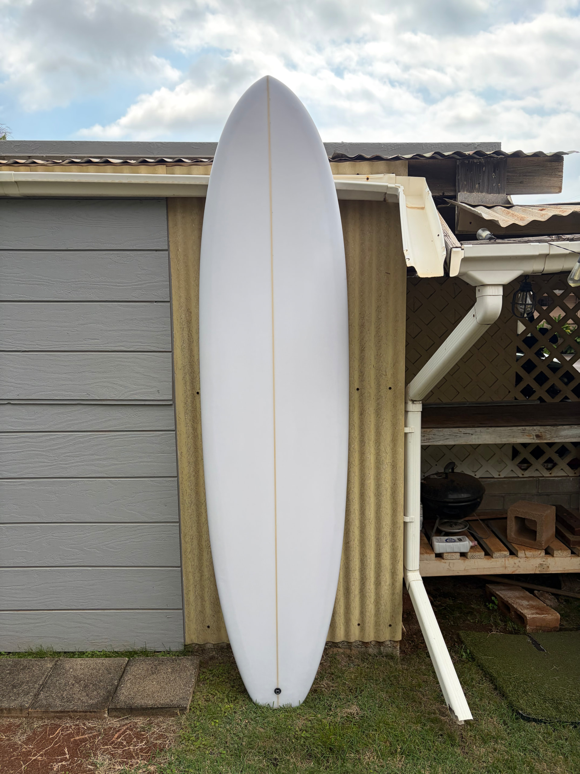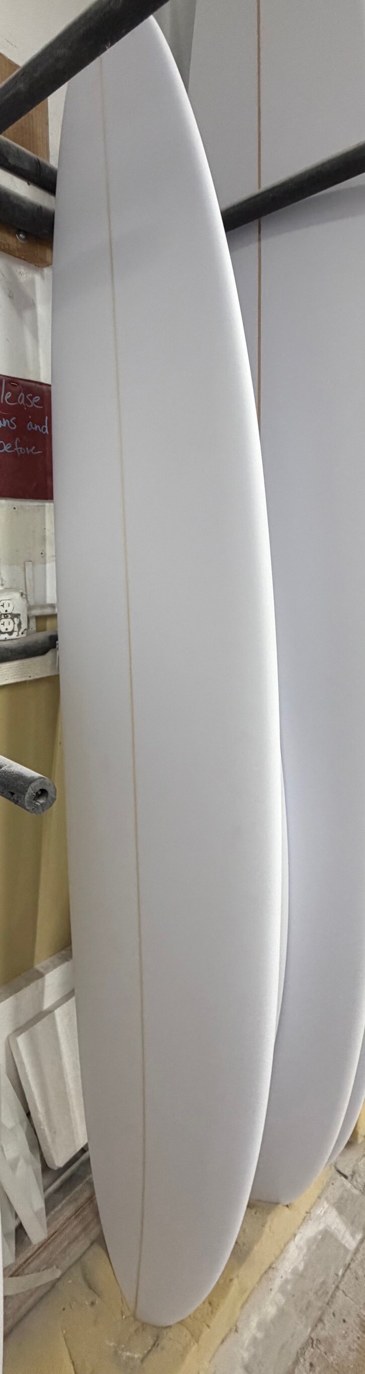 I almost can’t believe how good it came out - everything about it looks like what I would expect ‘my board’ to look like. The deck is semi-flat with a nice taper to the rails. The bottom is fairly flat to about 3/16” single concave, to about max 3/16” double concave to vee. When the board is standing up the shape has a really nice flow to it. The tail is wide but doesn’t really look it.