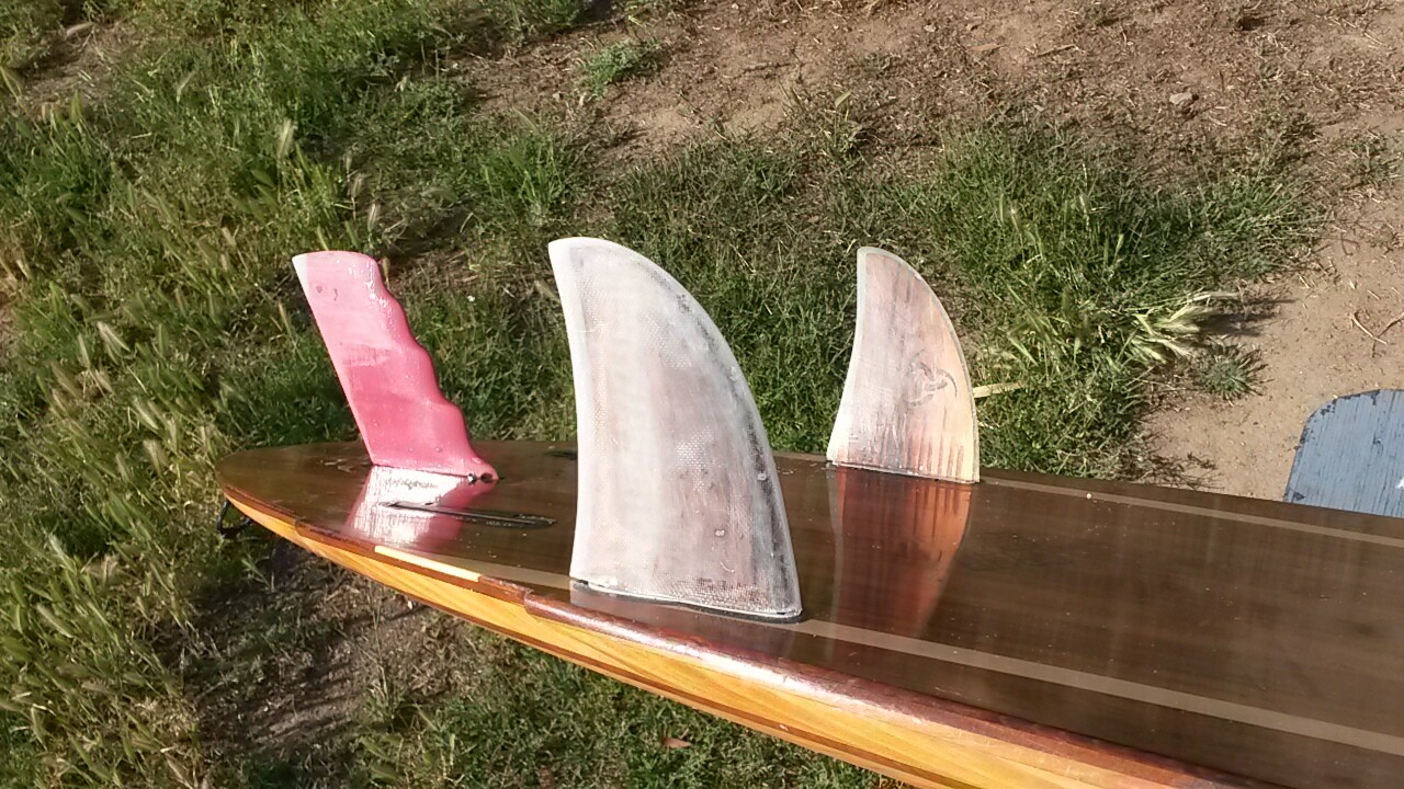 These High aspect ratio sharky or turbucled fins are a trip. These are an extreme experiment, in high aspect ratio in multifin boards, but for being large deep fins that look so untraditional and just wrong, they have noticeably and undeniably less drag than smaller more traditional dol-fins shapes. They also allow for a much tighter turning radius, to an almost ridiculous knee collapsing degree. They are super quick, super loose, with a lack of self centering and stability, compared to a more traditionally shaped fin. I wonder what a more youthful rubberkneed surfer could do with more speed and a tighter turning radius should they get over their untraditional look, and try them.