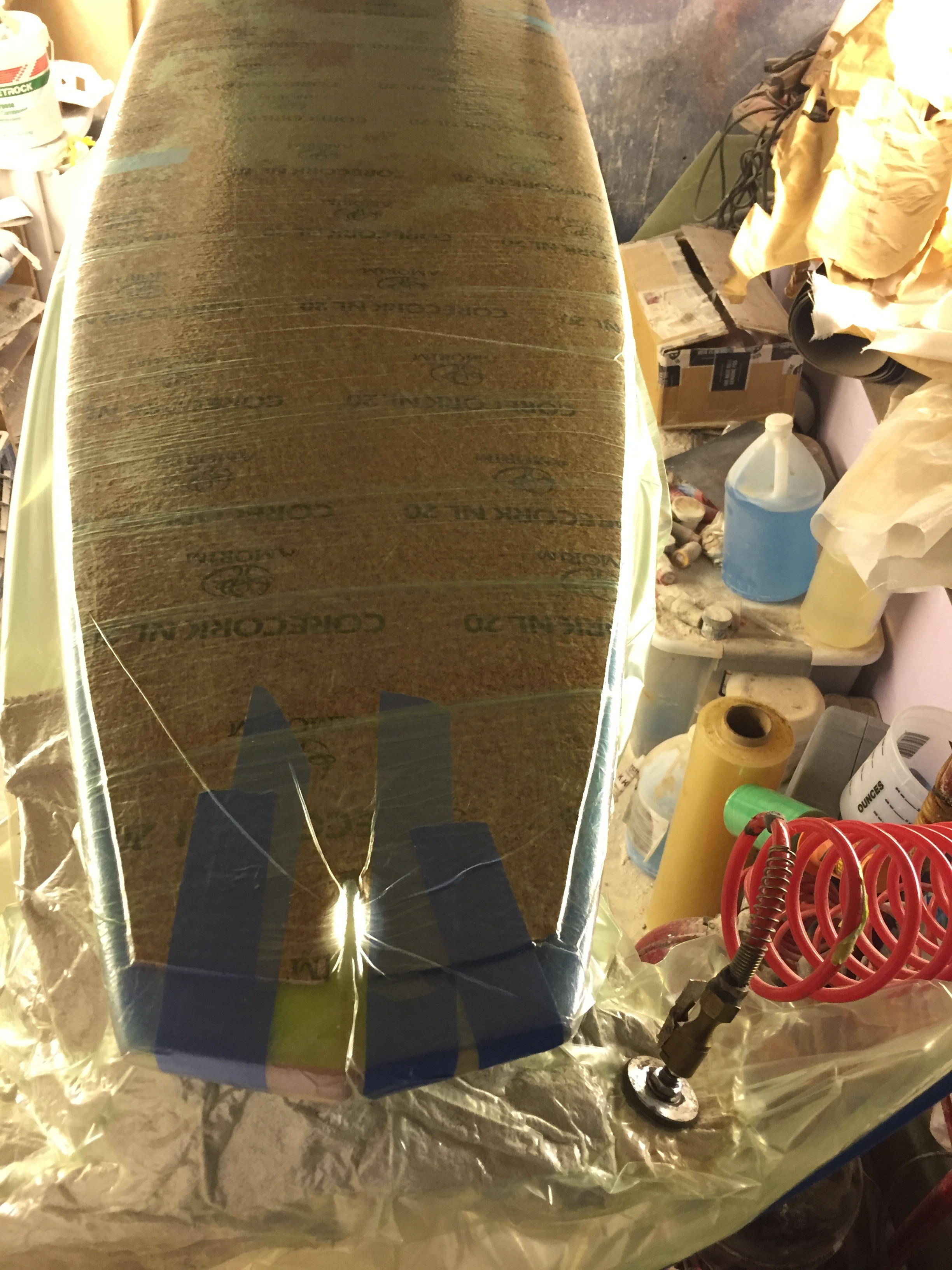 The glass under the skin comes from Bert’s advice on Compsands. A layer of 2oz wetted out has less resin than just putting it on the skin. Probably not necessary with the cork working as a bleeder for the extra epoxy, but it is easy to see the cloth get saturated and stronger.