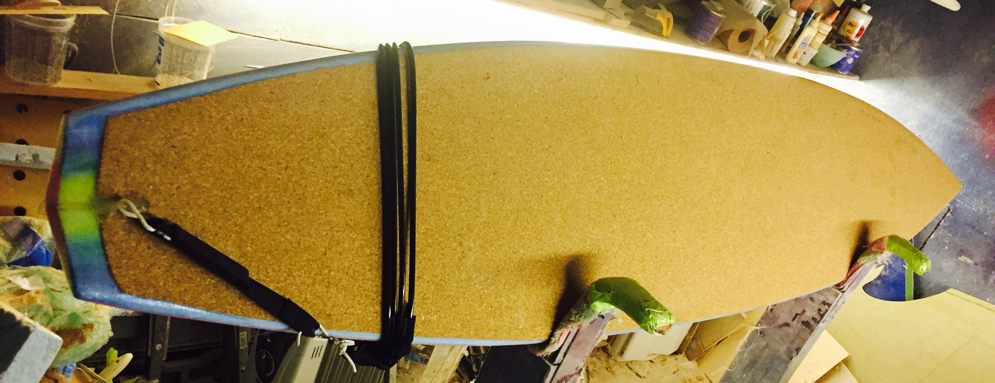 When I do the cork by my self I peel back half of the skin and wet out the glass on 1/2 of the board. Then I back butter the edge of the cork with epoxy and repeat on the other side. Next I put down a layer of Saran Wrap over the wet parts. Then a little tape and plastic wrap- tie down material. Picking resin stuck tape off of boards is a pain! After it is wrapped I slide it in the bag and suck out the air with a shop vacuum. Then I massage the bag to wher I want it and hook it up to my vacuum pump- fridge compressor. With a new bag it ties on every 5 minutes because my connection leaks a little.