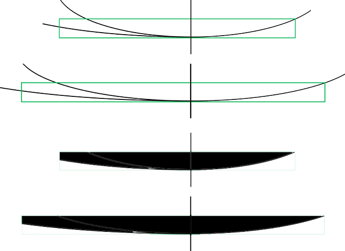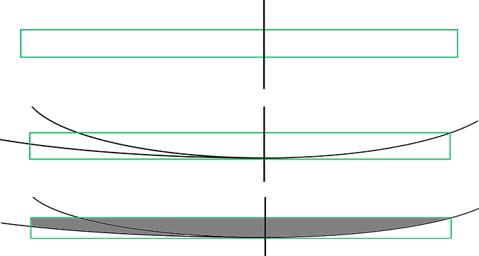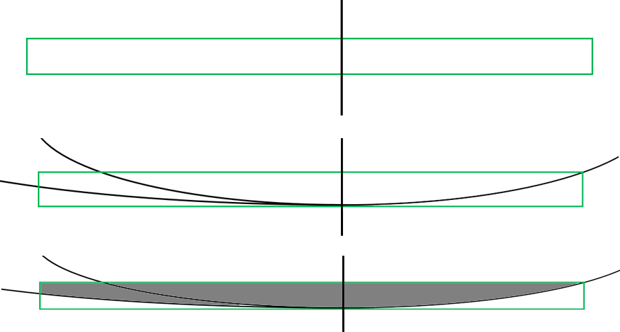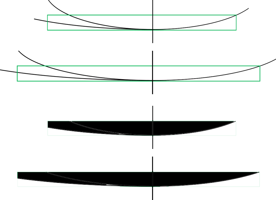 I liked your earlier perspective that rocker is/should be an extension of planshape. I have been playing with that idea and the green overlay box above. Create an overaly box with height equal to desired nose rocker height. Divide the box with a vertical line. The front and rear sections of that box are proportional to the front and rear sections (relative to the widepoint) of the planshape. Align the overlay box vertical line with the widepoint of the planshape. Stretch the box until the top of the box front corner intersects the front curve of the planshape (bottom of box is tangential to the curve apex). Group the curve with the overlay box as one image. Increase the box length (with curve) to planshape length – with aspect ratio unlocked. You now have a bottom rocker curve generated from the planshape, with the same asymmetry. Hard to describe with words. Graphics below: