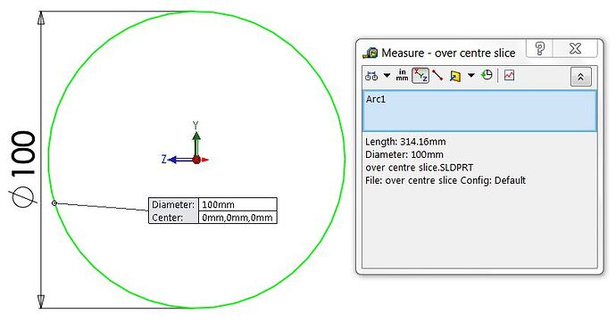 Further to that is the question of, Why all the measurements? I did the board in a concept rather than in dimensions because with solid works files you can go back and change sizes (dimensions) and the whole thing up dates, so you type in the dimensions of the board you want and … there it is. In this case I have made the dimensions proportional, the width is 100 (Why didn’t I make it 200 so the centre to widest point is 100?) well … for a goos reason. As I explained in an earlier post, people wanted certain lengths and widths, eventually I realised they were in a proportion of phi … 3.14. So the length of the board is 314 times the width of the board. For easy maths I made the width 100 (and for confusion on the proportions concept) proprtions and actual measurements used are two different things. So when the width is 100 that is halved and the centre line too widest point is 50 and half that for a slice line is 25 and half that for the other slice line is 12.5 … and 6.25 (but I put 6.35 by mistake). Being human has its limitations. Here’s a pic showing the length of the circle.