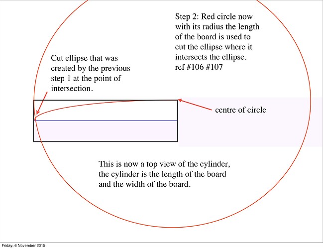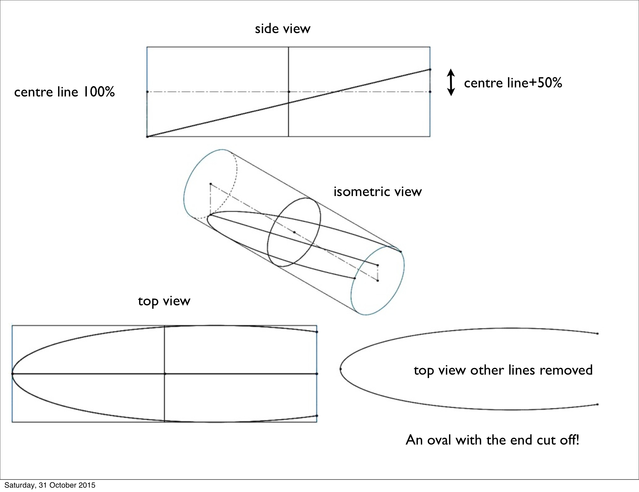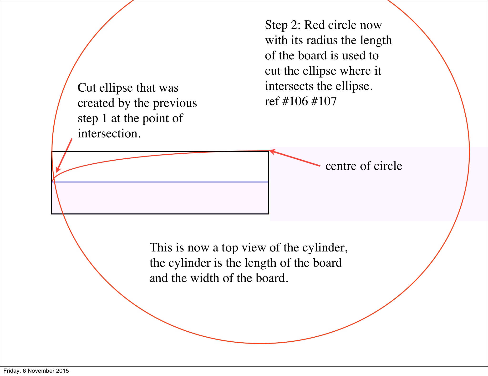 Thanks for your response as you promised earlier. You have put a lot of effort into it and I can see how my info is confusing you and the others. 3D Cad is the mixture of 2D cad drawings as the drawings are done in 2D on planes, I think you have drawn the side plane and the top plane. (I’m not sure why you extended the angled lines, that’s what confuses me)? I will try and explain it in the form you have presented. Basically as I see it at the moment, you have just misunderstood the reason for the circles, (your light blue circles), and therefore not centred them correctly. They are only there to control the length of the red line used to slice the cylinder and (in the top view) to cut the ellipse to the length of the board. If I’m right then the following might clarify things for you. I hope so. You obviously want to find a workable 2D representation.