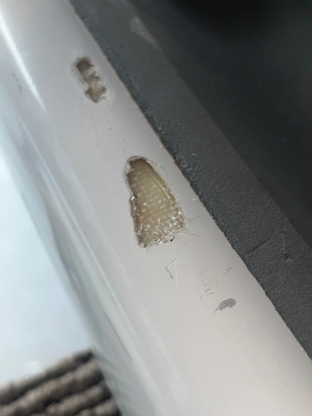 I repair many boards with this kind of tech i bet fiberglass is not needed and harder to do clean here. I bet board is still waterproof here because that’s only the thick finish mastic coat that chip off the main fiber skin because of not care when prep lam for overcoating during build, not appropriate mastic and too thick layer for compensate not “flat” job. The layer of makeup is thick on those build. They use cheap easy to sand mastic and nice paint to have a nice finish LOL.