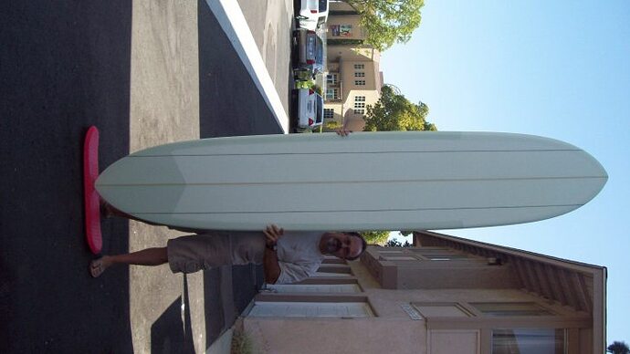 Starting with the latest I made. I picked it up from the glasser's just this afternoon. I wish I could say I glassed it but the truth is that this outstanding job is Paul Lefevre's work. Paul is a young and talented glasser who works with Axel Lorentz (remember "The Enterprise" thread?) and he really understood what I wanted this board to look like. It was glassed with double 6oz top and 6oz bottom silane cloth and volan patches were added to the top (from the tail to the curve of the step-deck) and to the bottom (around the fin-box), cut about 2" inside from the rail in both cases. In spite of all that glass (and quite a lot of volume), the board is surprisingly light for its size. Photos: