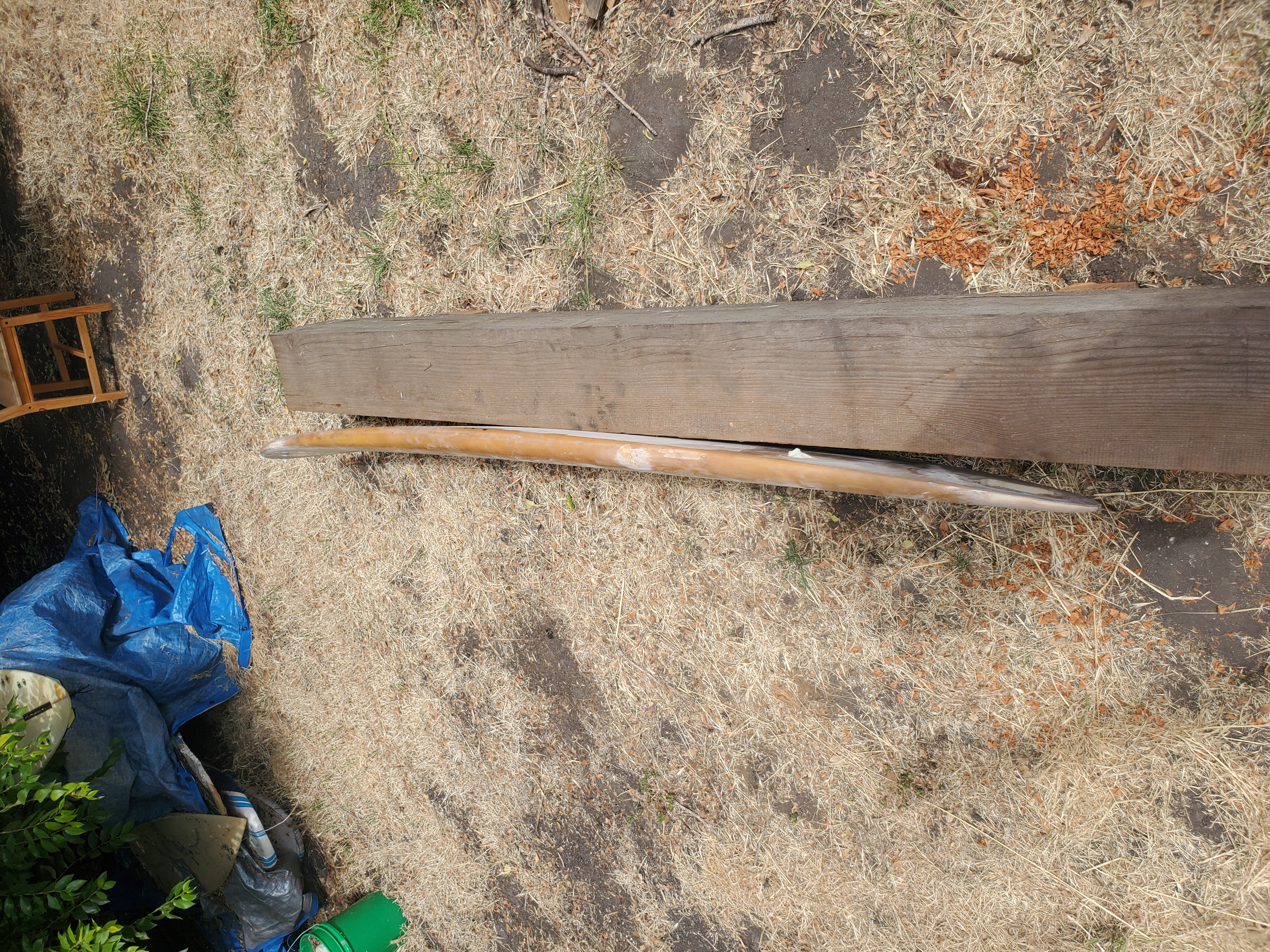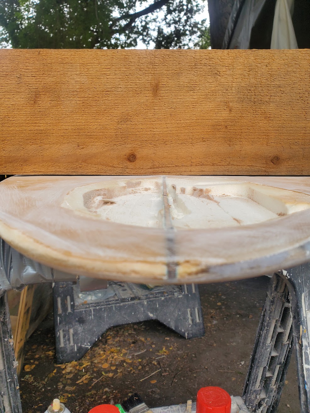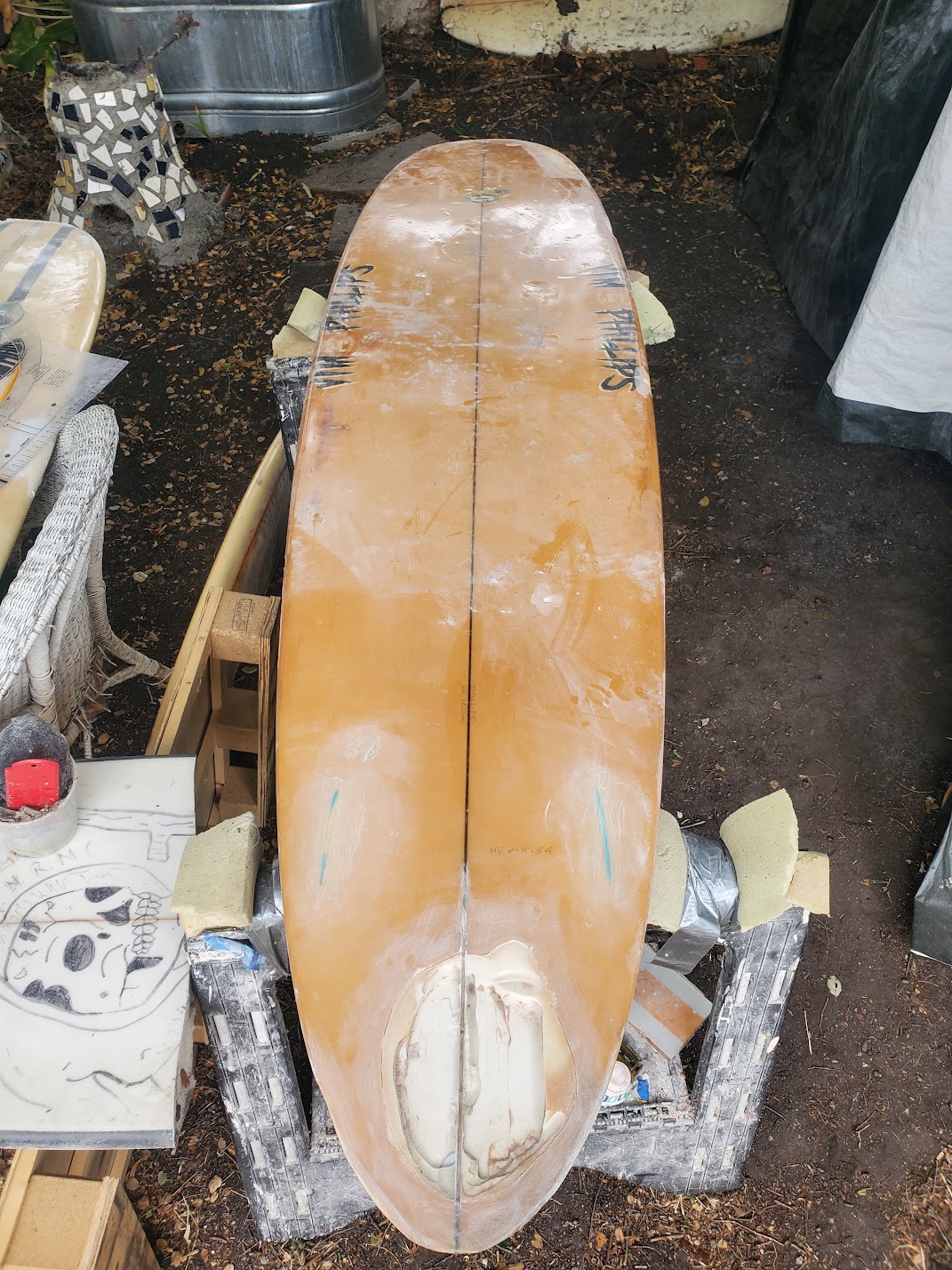 The boards’ 7’11 x 21" x 16" (tail) x 14.5" (nose) x 3"; it’s gotta moderate vee bottom from about 1’ in front of where the side fins were and runs through the tail, slight belly through the middle and a slight single concave nose. Also the entire area around where the center was was extremely delaminated and rotting, so I routed it out.