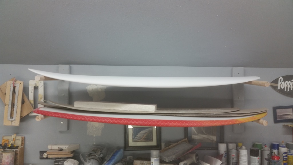 #4 almost finished, 2 7/16 thick, just an extra 1/16 to compensate for a little added rocker, however after measuring the rocker before and after glassing it appears that I have lost almost 1/8inch - I assume that the curing fivreglass has pulled the rocker flatter. Something to keep an eye on for the future. The tail was thinner than usual and pretty flexible, so perhaps that is part of the reason?