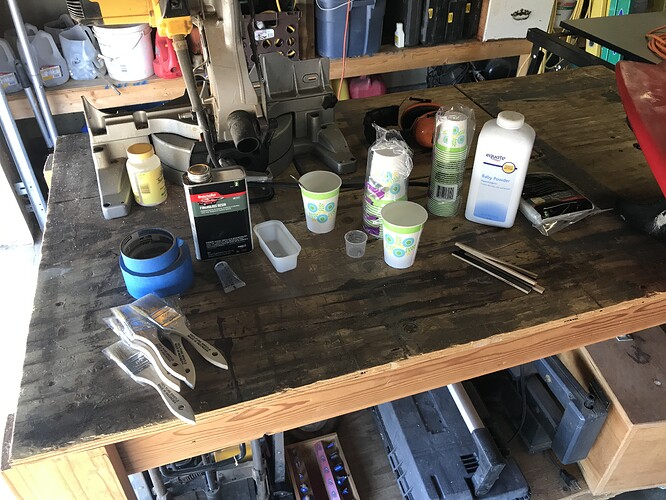 Today I started by repairing the nose. I used Bondo brand resin and hardener (kit), $12 on the Auto aisle. I also purchased a couple square feet of what looks like 4oz cloth. Nothing new here as far as technique, except that I added talcum powder to the resin to try to mimic Q cell. I feel that it worked pretty good, achieving a consistency thicker than resin, but not nearly as stiff as peanut butter.