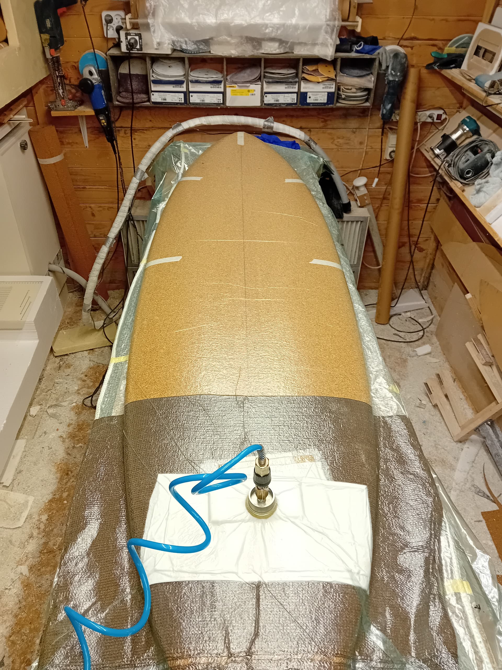 Finally finished this one. I made it from dense grey XPS, soft EPS foam and a balsa stringer. I glued up balsa wood and made a stringer copying my 6’0 Griffin 5 fin fish. I glued up the XPS and then cut rocker slices. I originally thought about making a fish, then I thought maybe a round tail, then I thought maybe an assym. I ended up with a round tail, 6-2 x 20.75 x 2.5. I used the Griffin outline, but then I used a round tail outline. The wide point is forward of center, like a fish. Single concave to double out the tail. I used flax and 4oz on the deck, 2x 4oz on the bottom with the last set of proboxes I have.