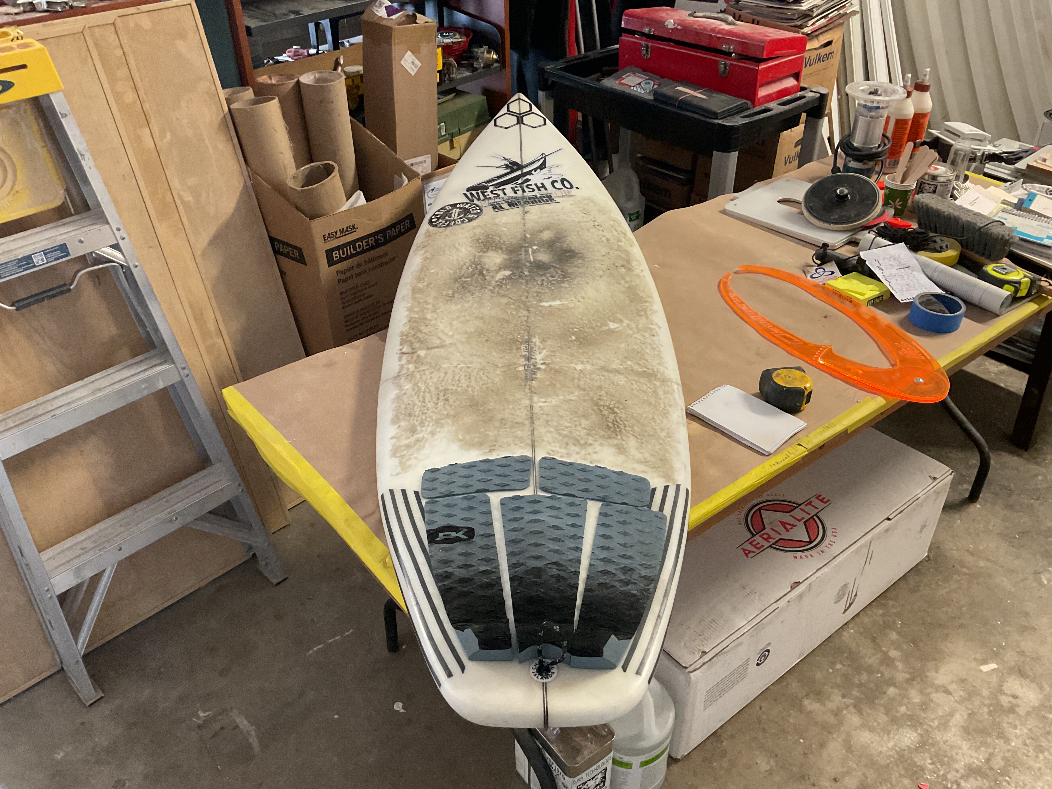 I was doing some work for a customer in Manzanita, Oregon and ran onto this homemade 7’0 in the barn. Going to clean it up, repair and re-do the fin. His dad and uncle each made a board in the 80’s and surfed them locally. It will be a surprise for his dad. Couple of 12 packs of “Mas Fina”. I’ll get a close up of the fin later. It’s about ready to fall off.