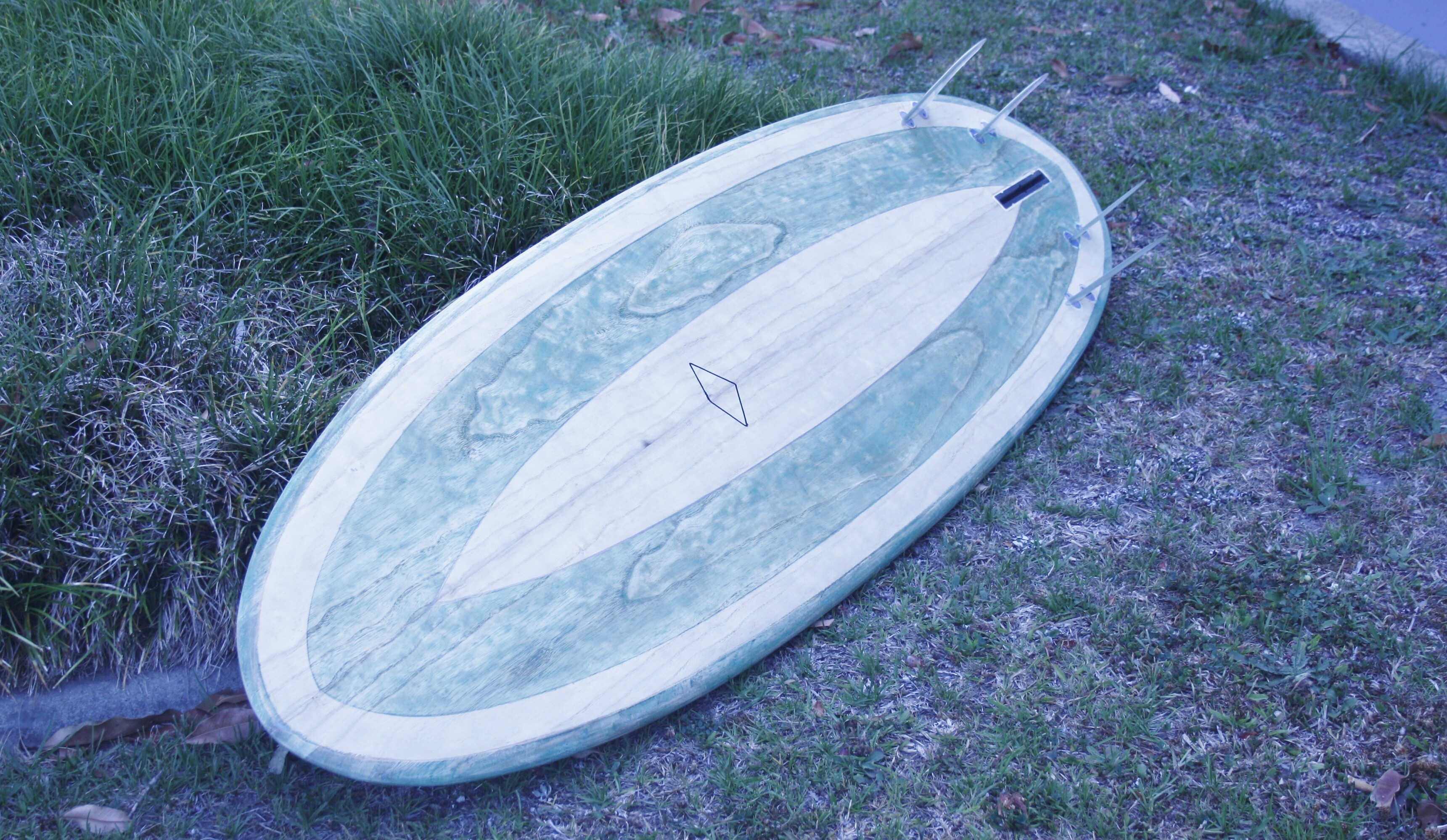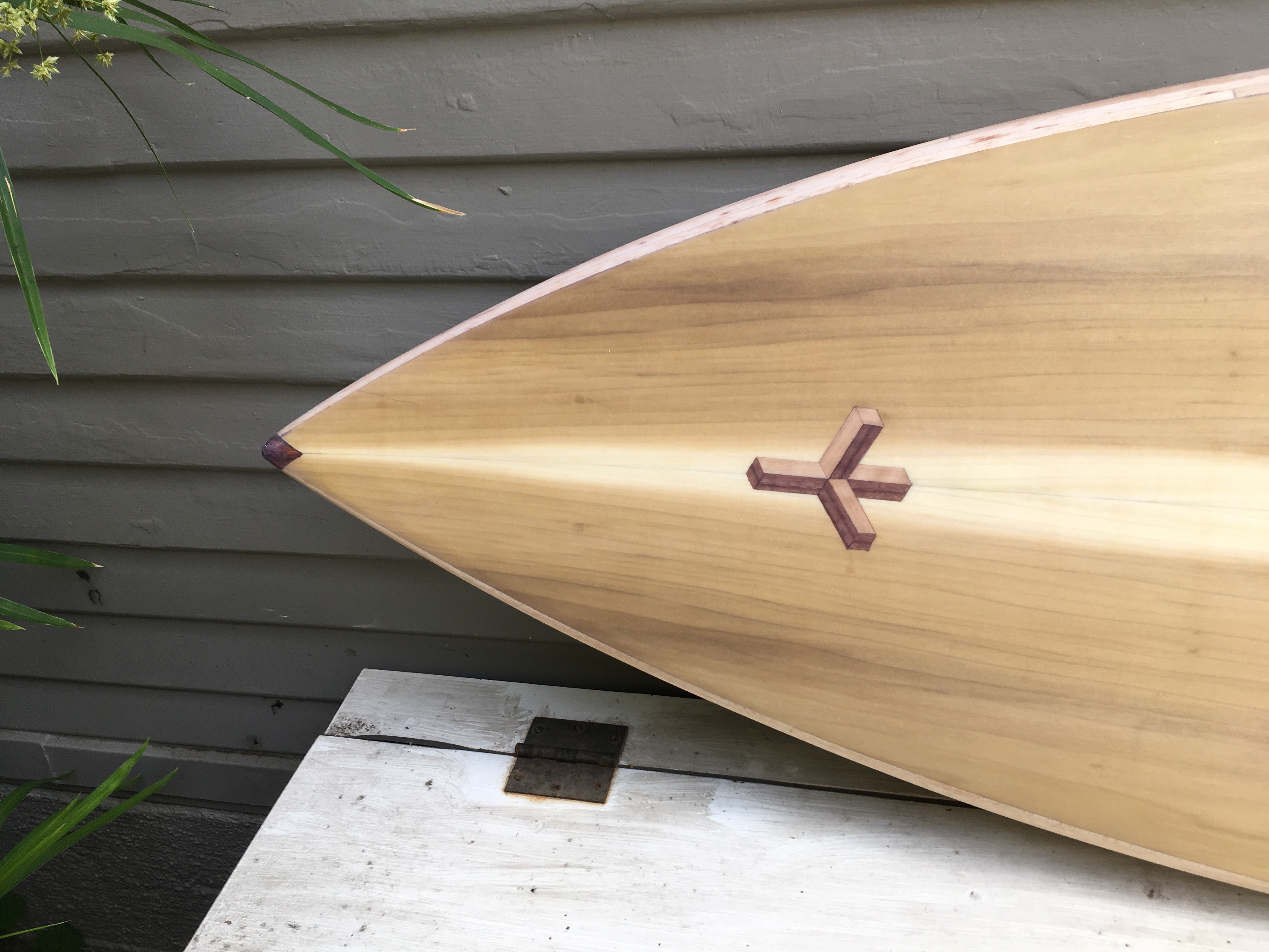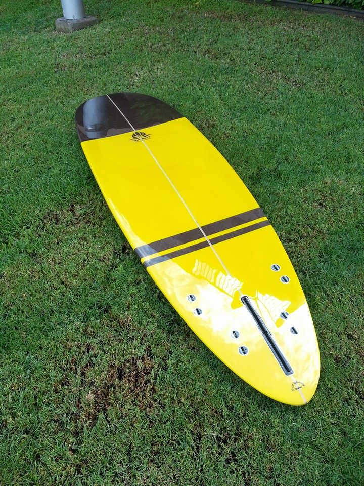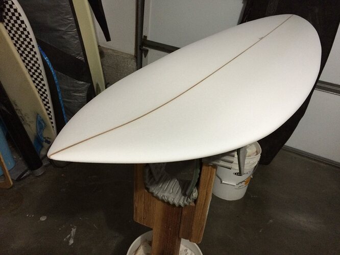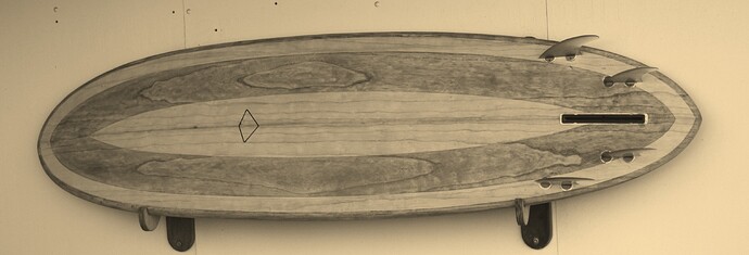 The “Barracuda,” made last year, is meant for my local winter spot which is mostly longboards. It carves the waves like butter (I use rasta keels in the board, not the thruster set up shown). I love it but it fails on a second design goal- to compete with longboards. It catches waves much more like a shortboard, even tough it is 7’-7" . I cannot chase them down from outside which makes using it problematic said spot.