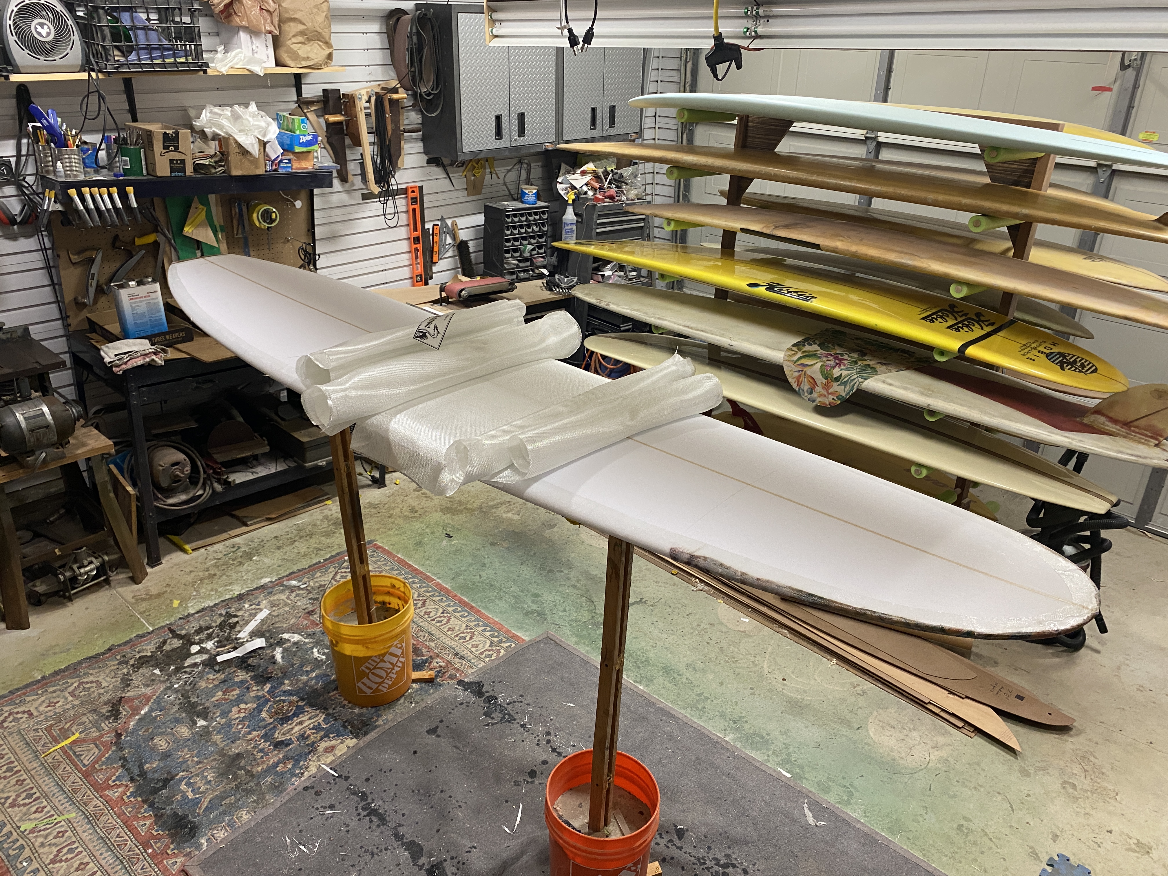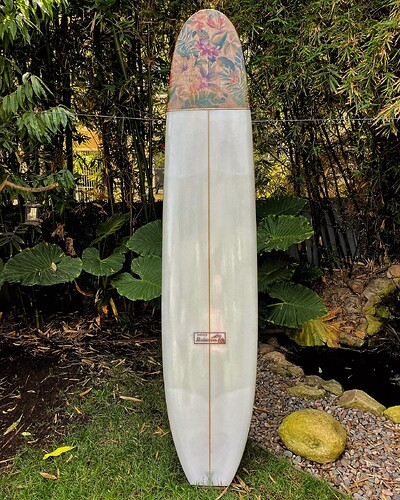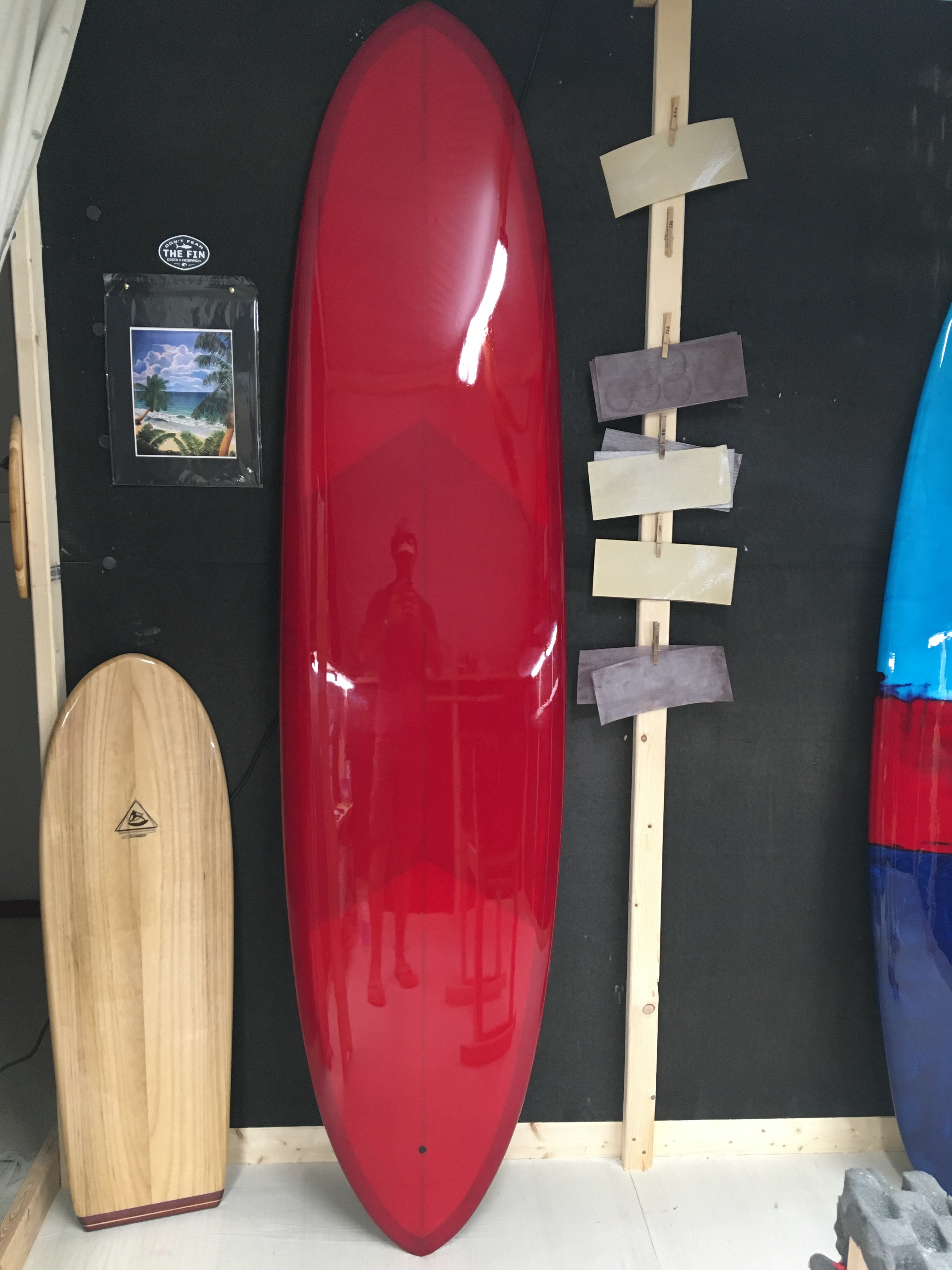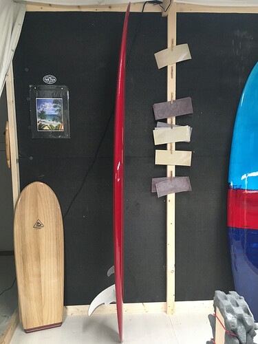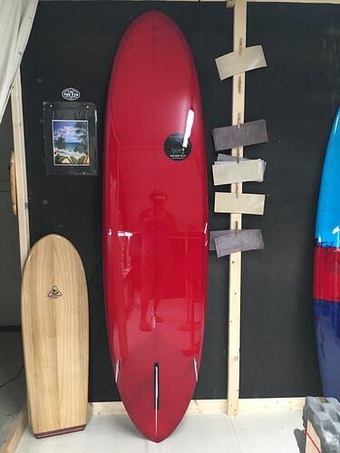 the red one is my attempt at something from the transition era after Bill’s input on my wife’s board and me deciding I needed a wide point back of my own. Ha. I wanted a mid length alternative to my longboard for weaker days. So I kept it thicker at 3 1/16", wide point back and 22 1/4" wide. She’s hulled all the way from nose to tail with moderate rocker for my beach breaks. This was also my first attempt at a deck patch that many here helped me with. Learned from it that the cloth can shift so I’ll go lighter next time on the initial squeegee.