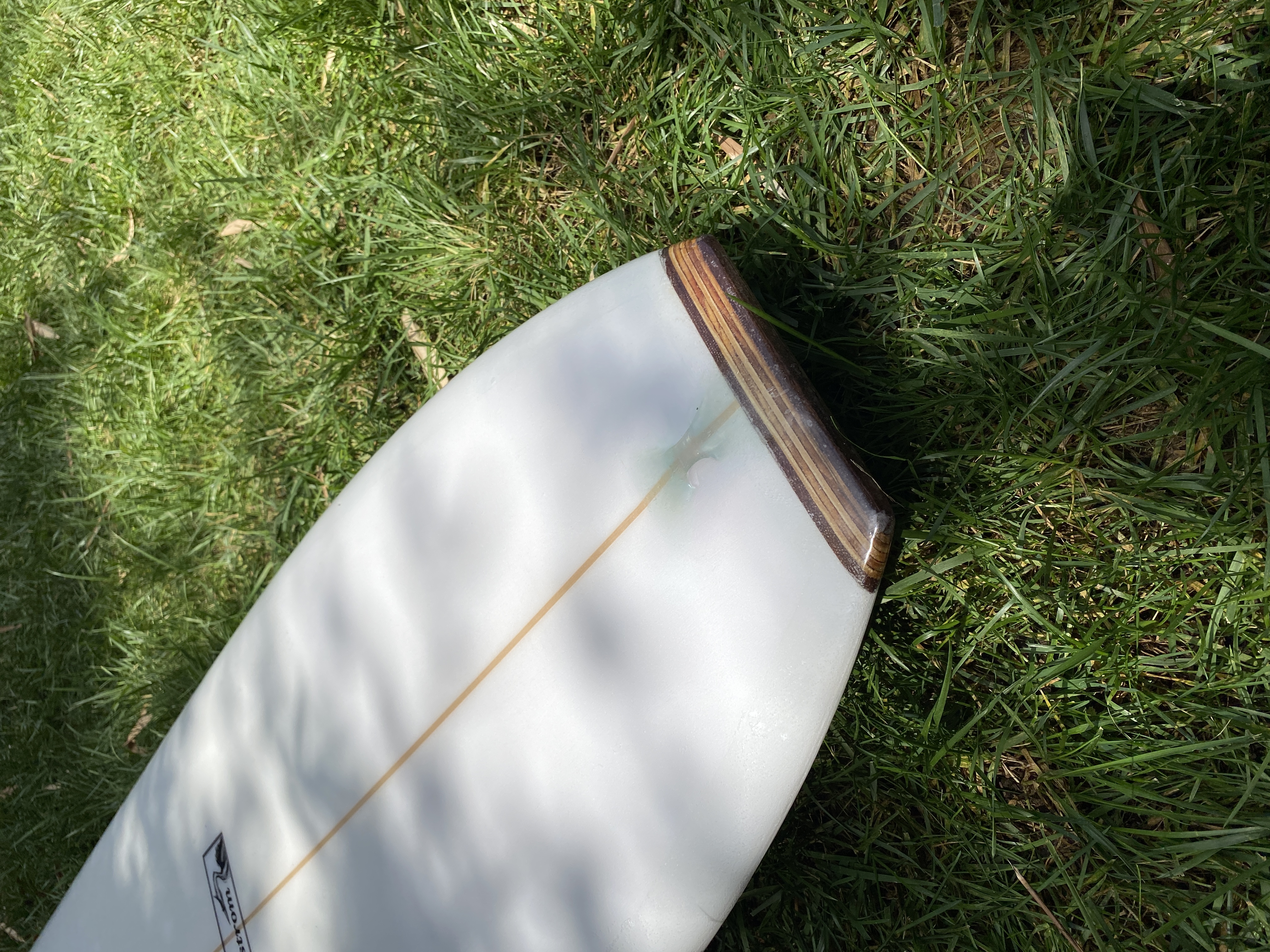 Latest board - 9’6 x 23.5 x 3.25 end of summer big ole small day pig with wood block, fin patch, deck patch, and nose inlay. Trying to start learning pinlines (even if they are fat and ugly) so the inlay edge has a resin line under the gloss coat on top of the hotcoat.