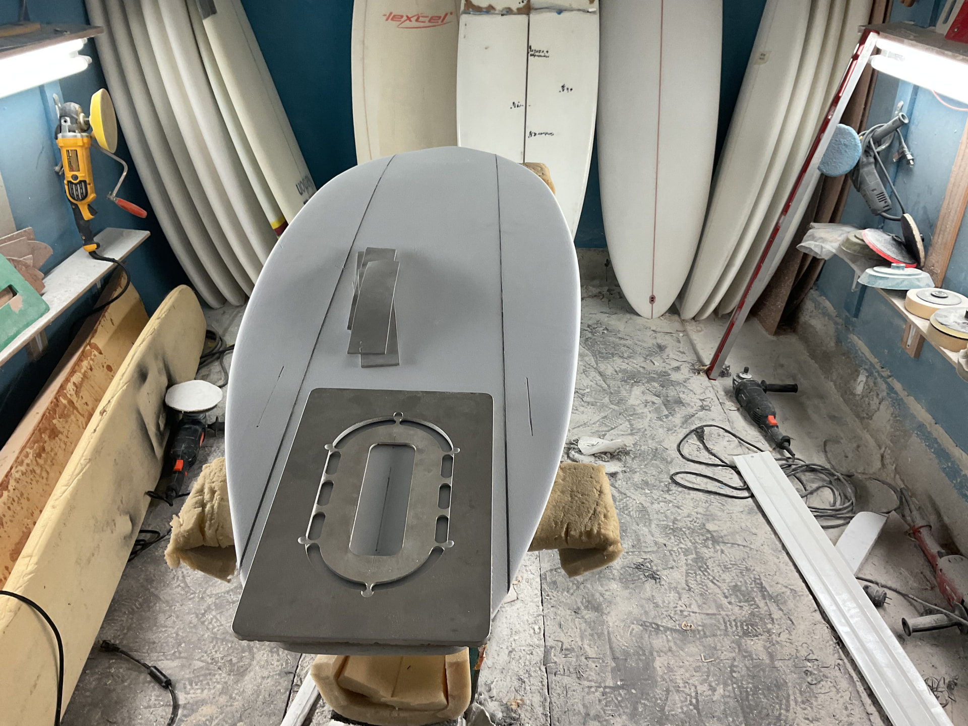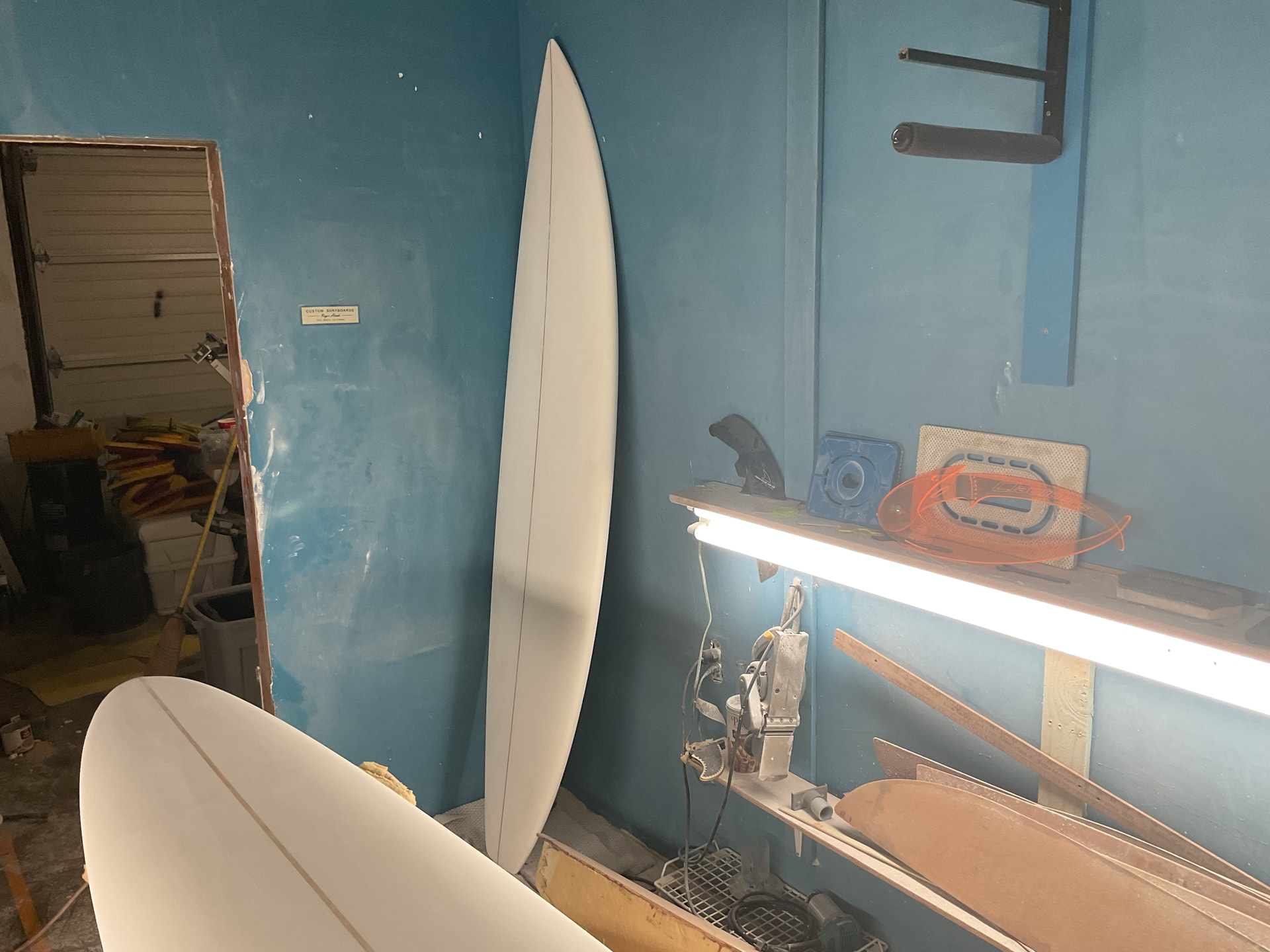 8’5 x 20”. It’s what most would probably call a “Semi Gun”. Single to double concave that’s pretty noticeable. I left it fuller and thicker than most shapers would. In the Northwest more paddle power and float are necessary. Longer paddles to outside bars and heavy wetsuits. I am having it laminated and sanded in Epoxy. Then I will “post lam” the fins and leash plugs, logos etc.