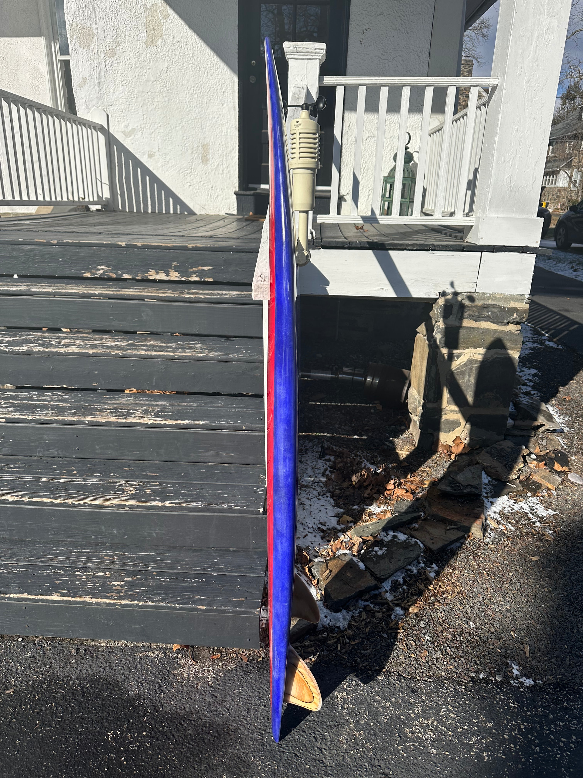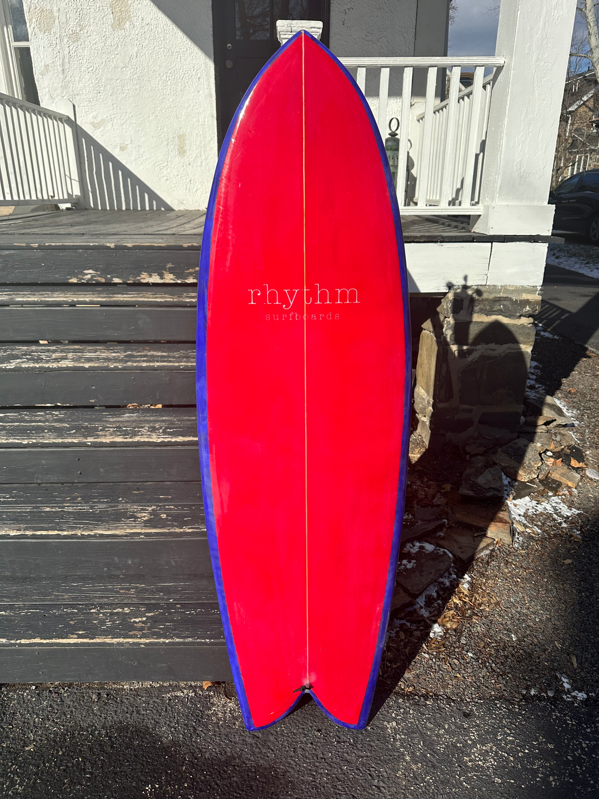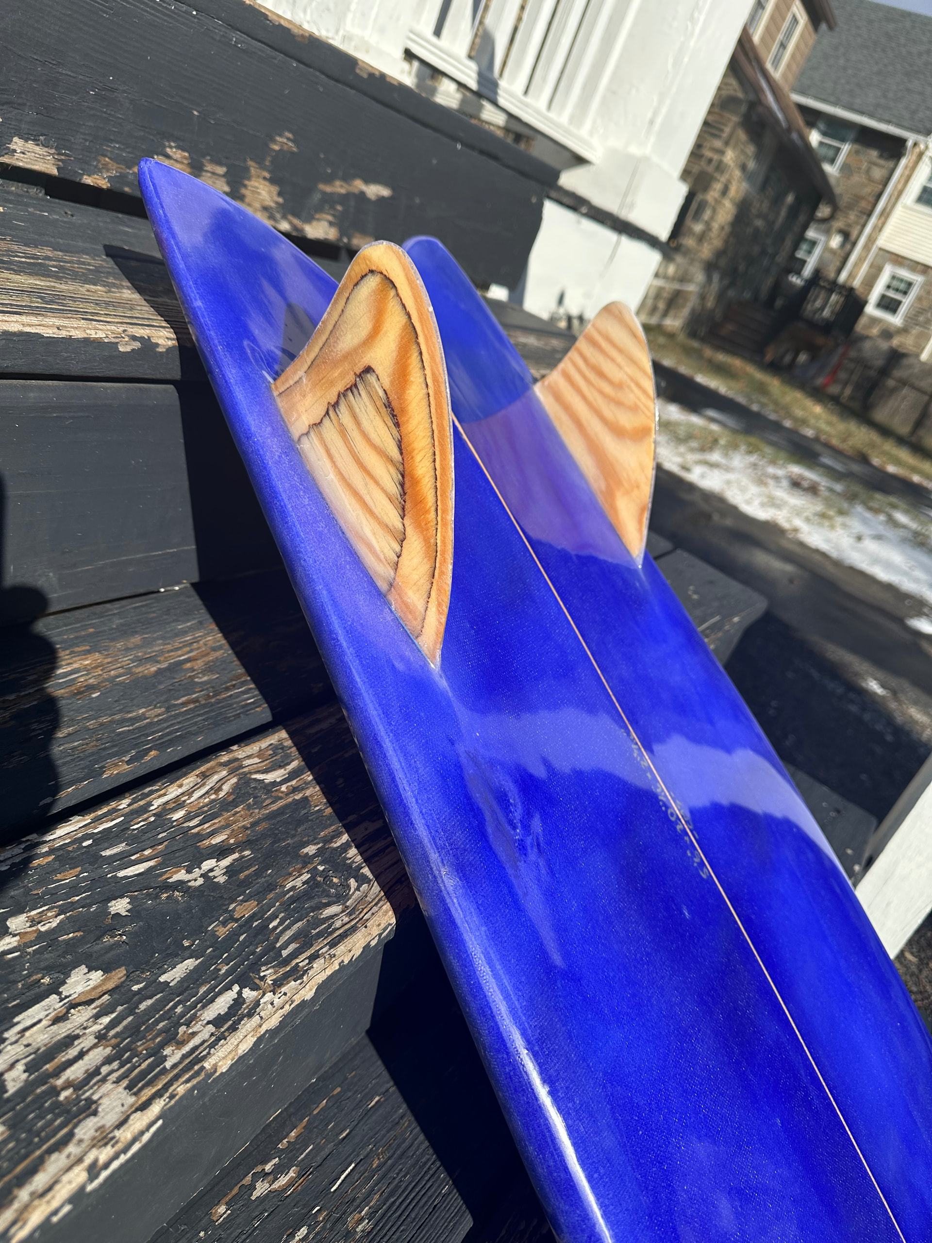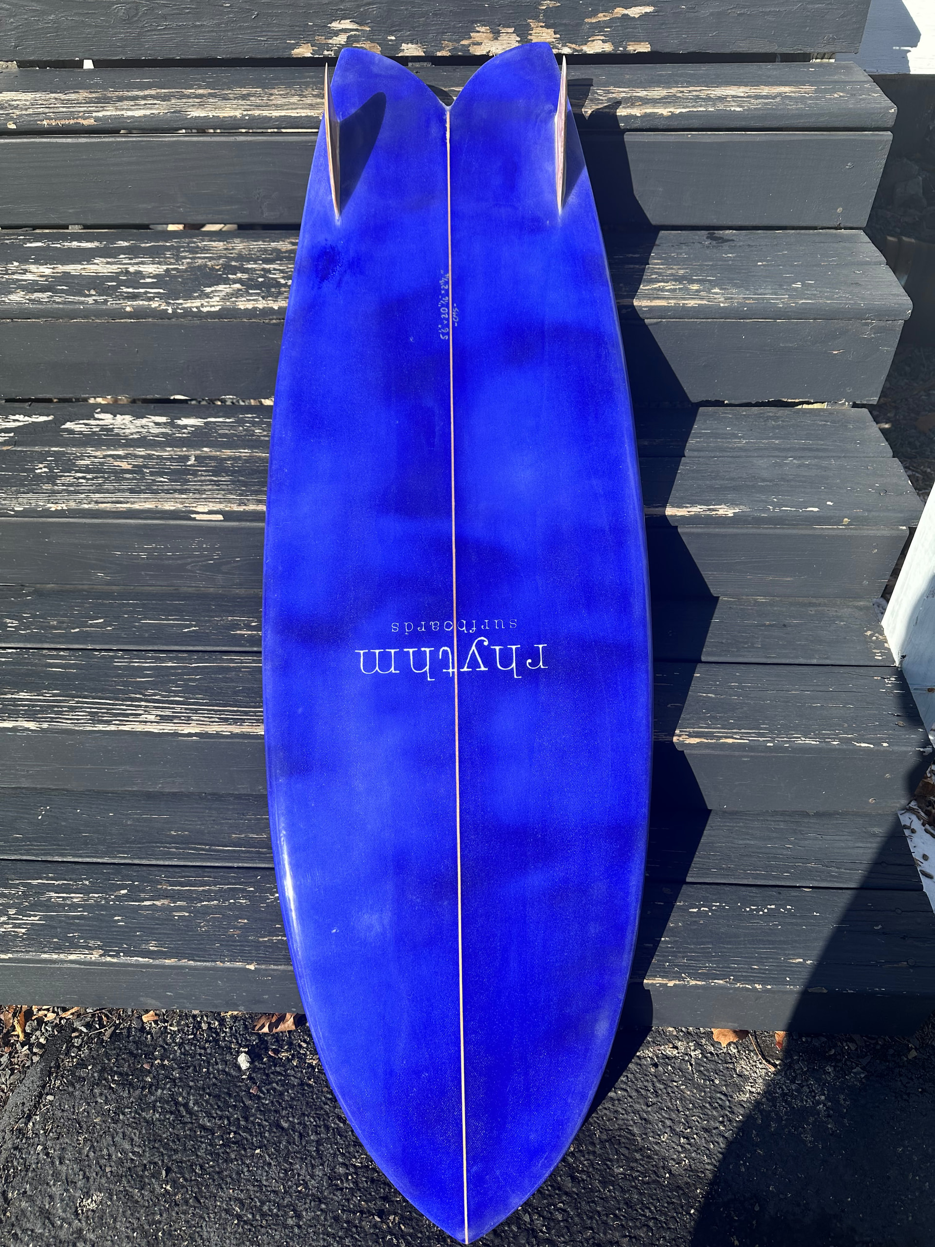 5’6” twin fish. Single to double concave to slight reverse vee at the tail. Now the wait for some waves…