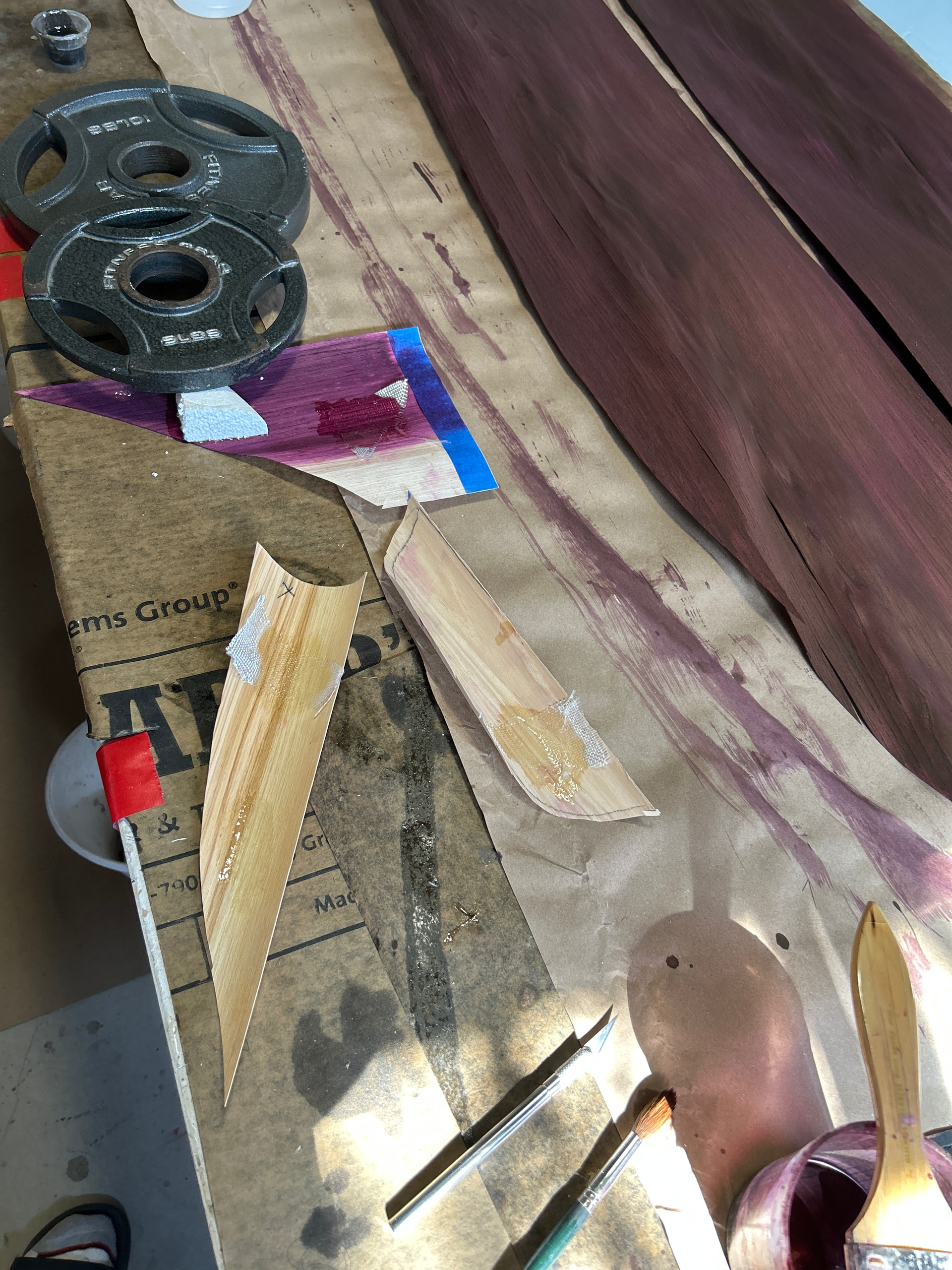 Now I’m doing peel tests with veneer softener, dye and veneer softener, and wet (just sprayed) softener (with the ‘X’). Oh and just to be sure - EPS and dye/softener. Also notice how much the color changed when sprayed with softener.